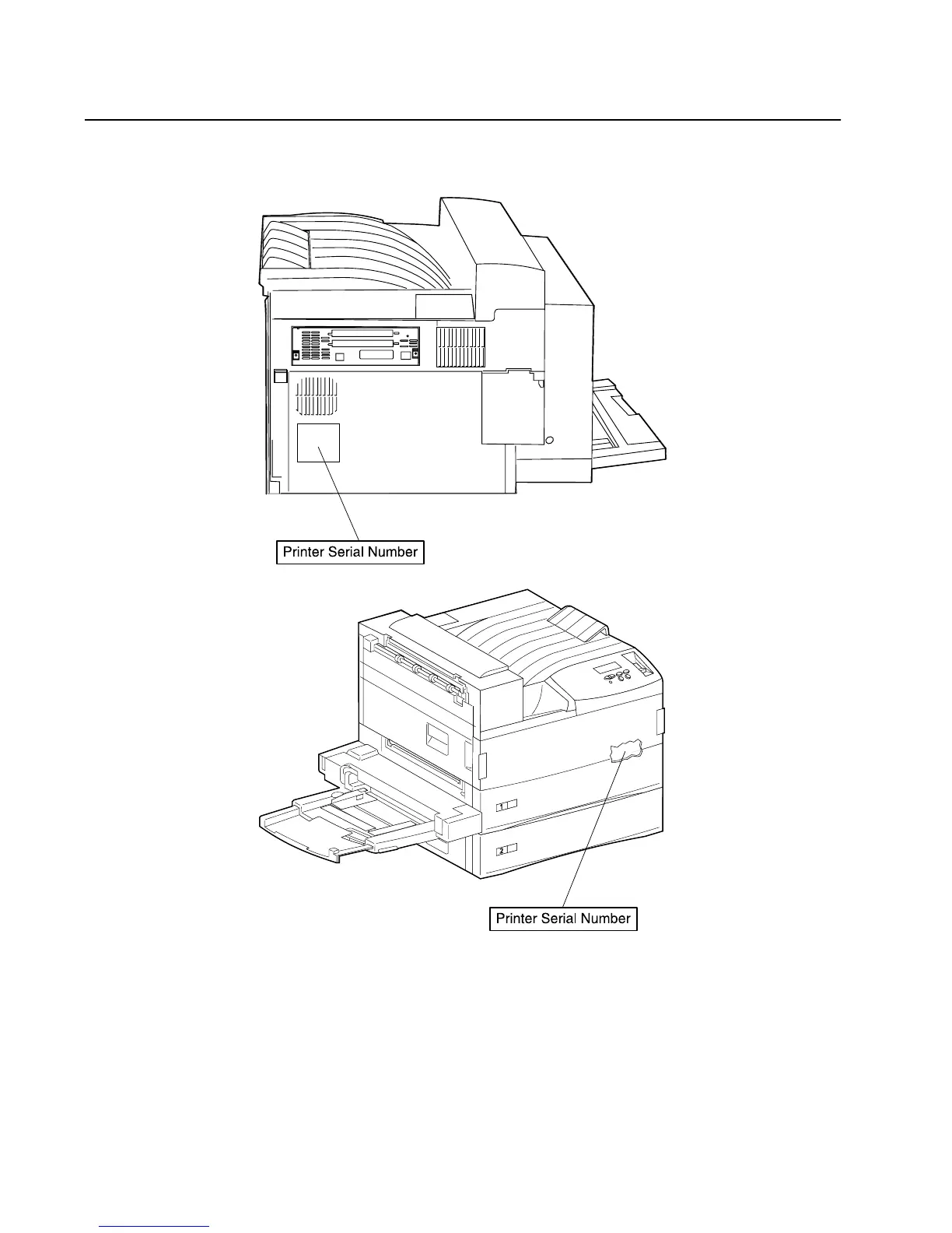Printer serial number labels are on the rear of the printer and inside the front cover.