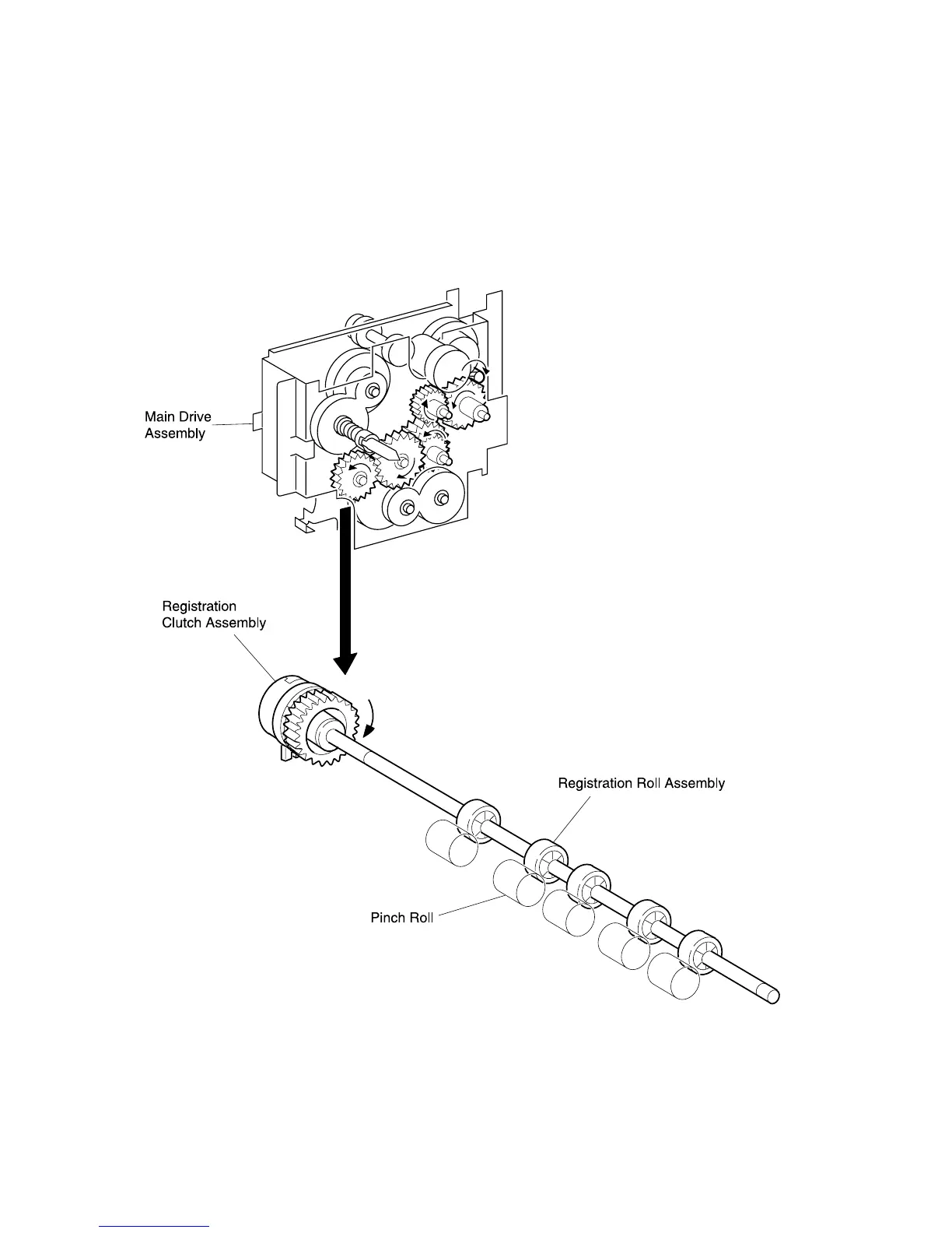 drum. The Registration Clutch transmits drive to the Registration Roll, which rotates and