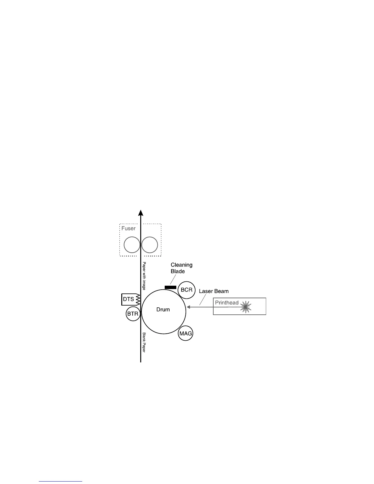 to the Fuser. The Cleaning Blade scrapes any residual toner left on the Drum after