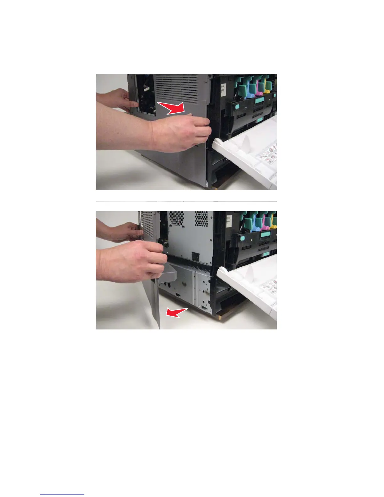 7. Slide the left cover back to release the tabs from the printer frame.