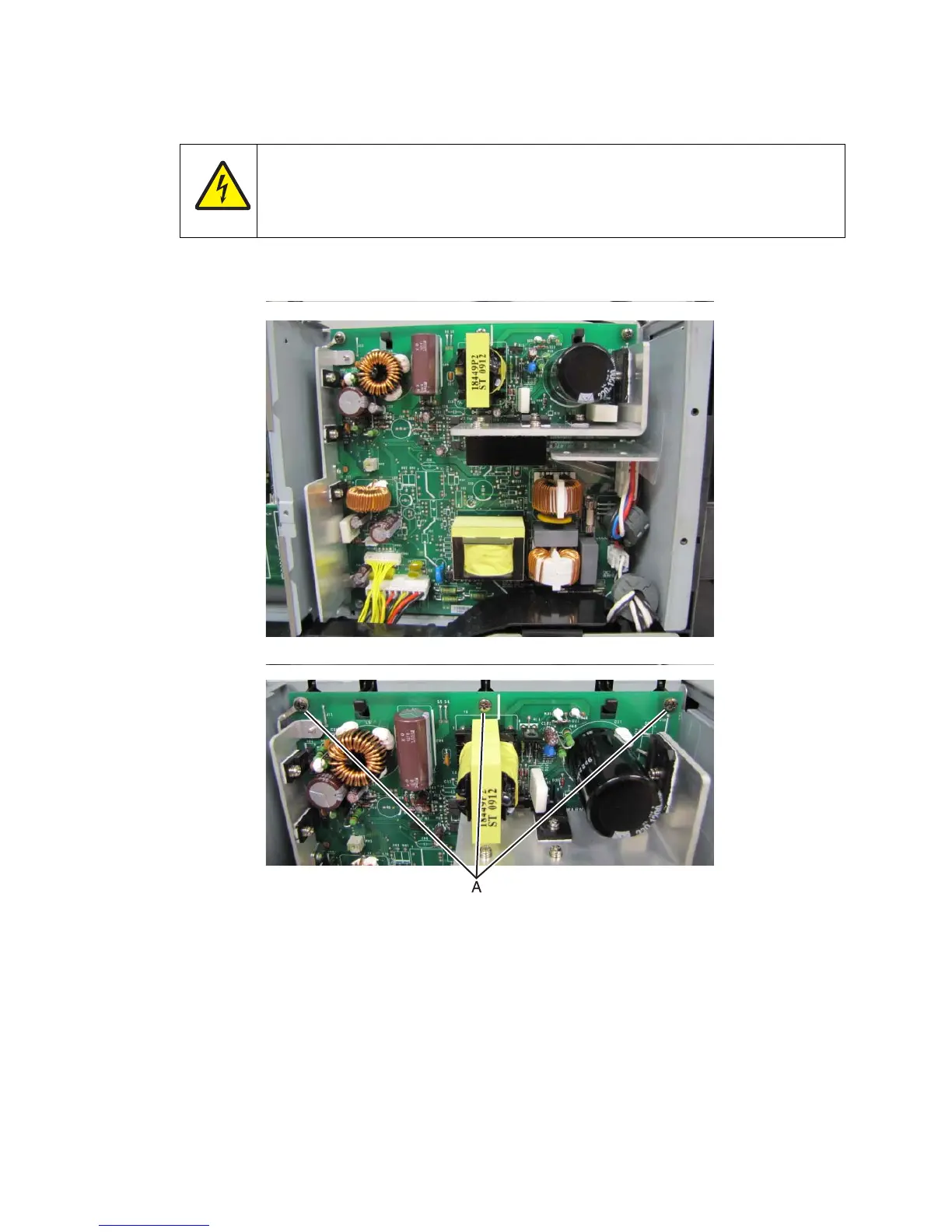 3. Remove the three screws (A) securing the top of power supply to the power supply cage.