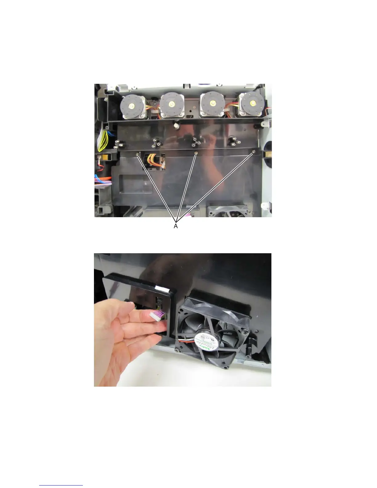 2. Remove the three screws (A) securing the fan mounting duct to the printer.