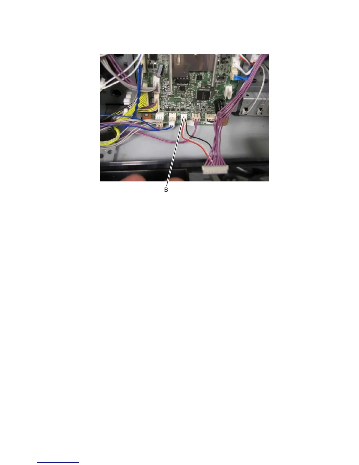 4. Disconnect the fan cable (B) from the MDCONT (engine) board.