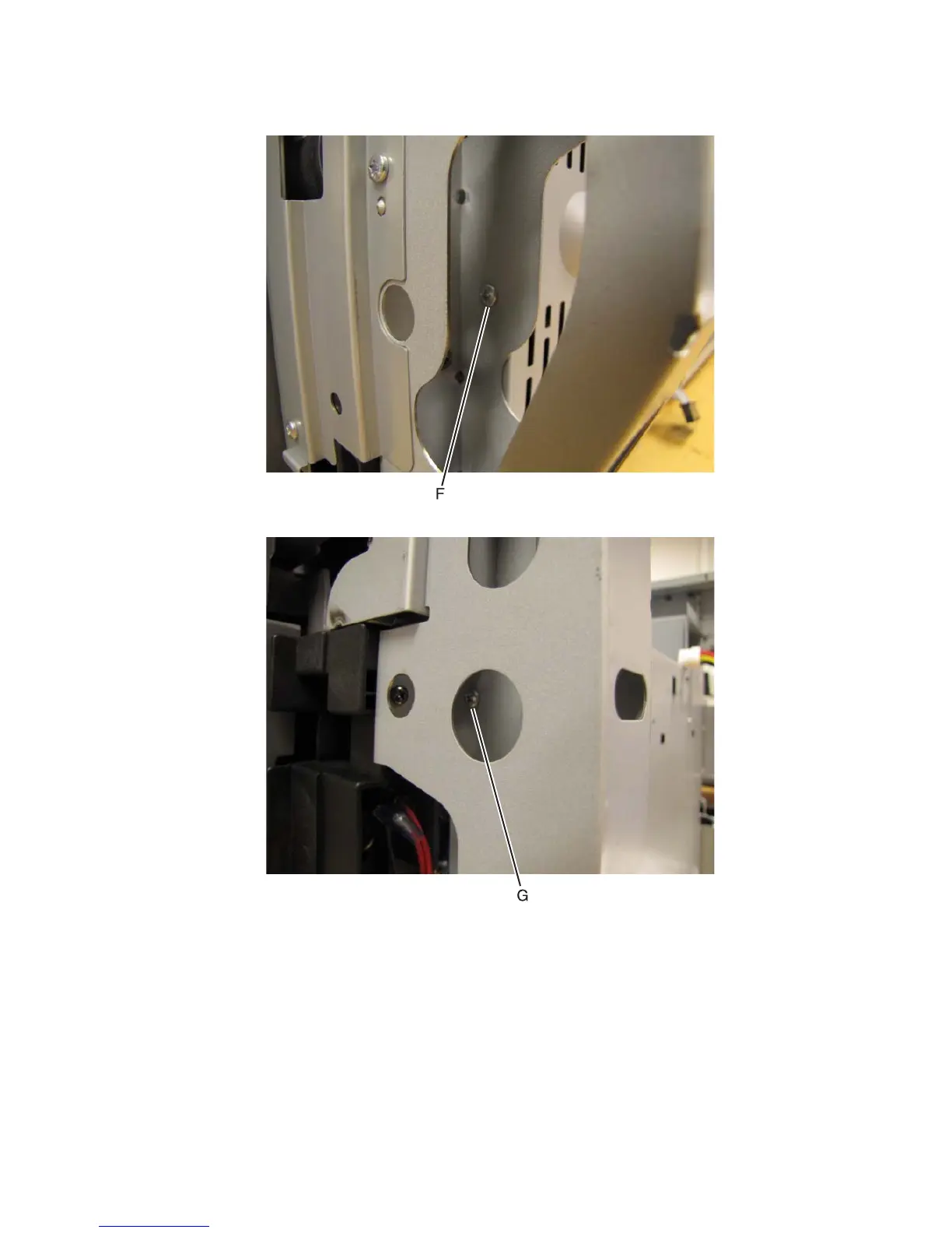 9. Remove the upper screw (F) securing the emi shield to the cage.