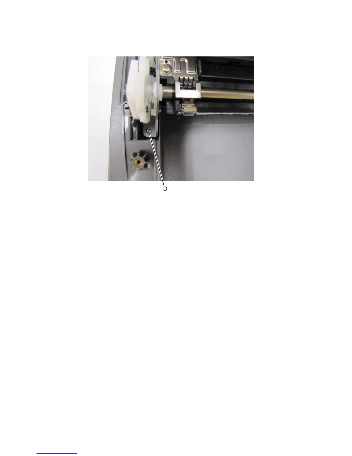 8. Remove the screw (D), beneath the spur gear, securing the right side of the ADF main feeder to the top
