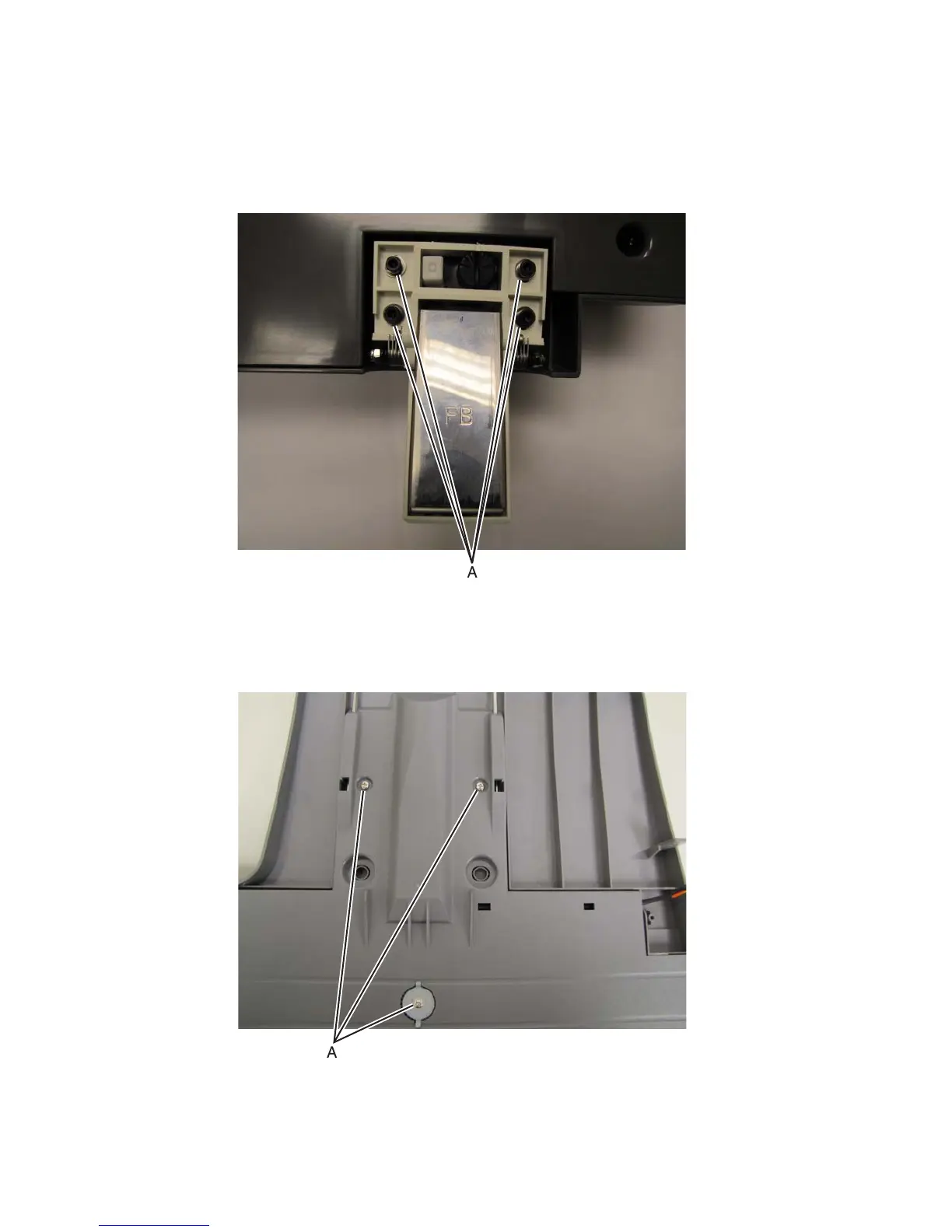 2. Remove the three screws (A) fastening the tray bottom to the ADF input tray top.