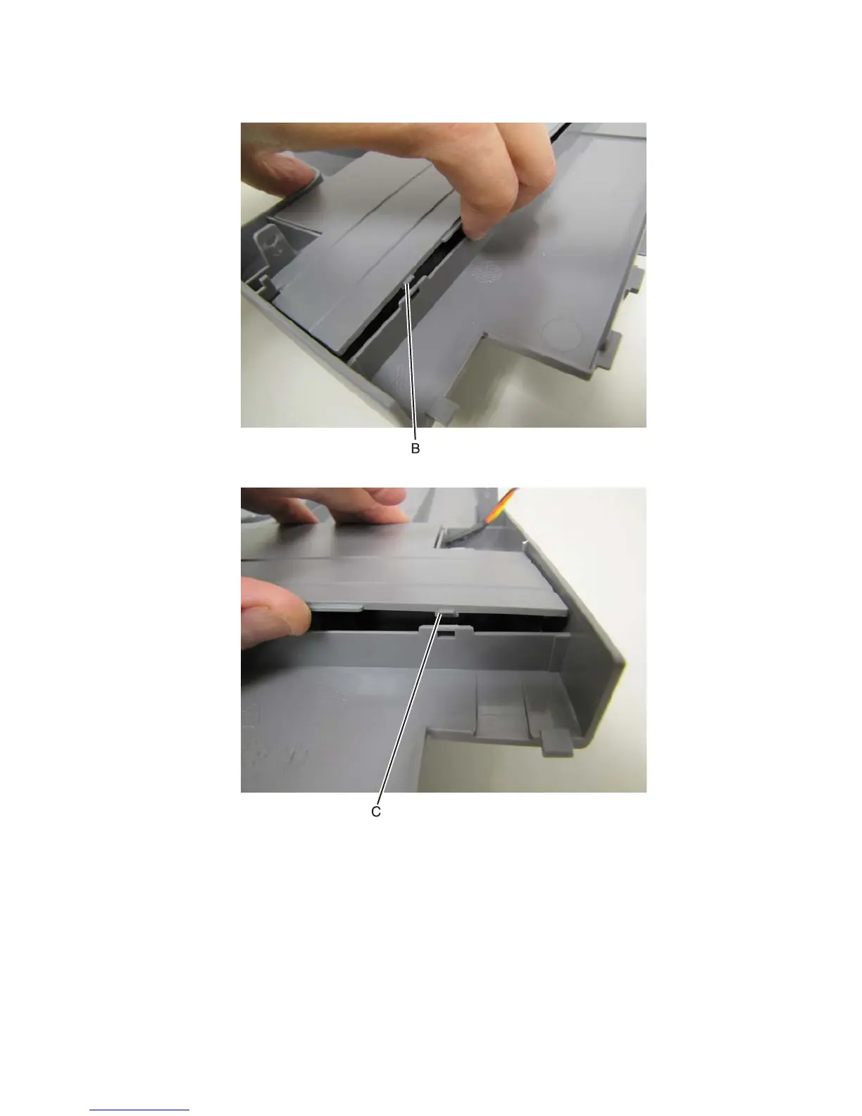4. Release the tab (C) securing the tray top to the tray bottom.