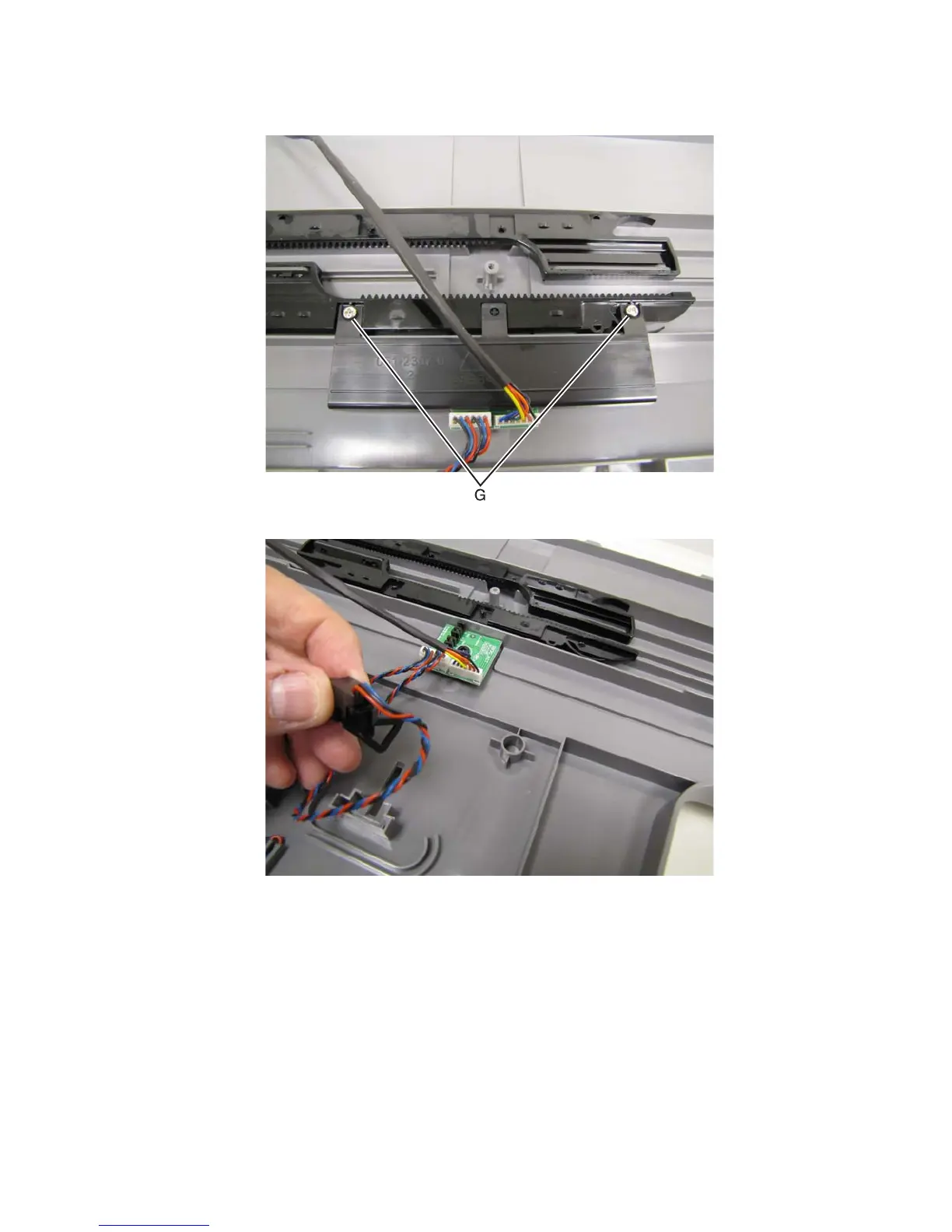 8. Remove the two screws (G) securing the paper width actuator to the rack gear.