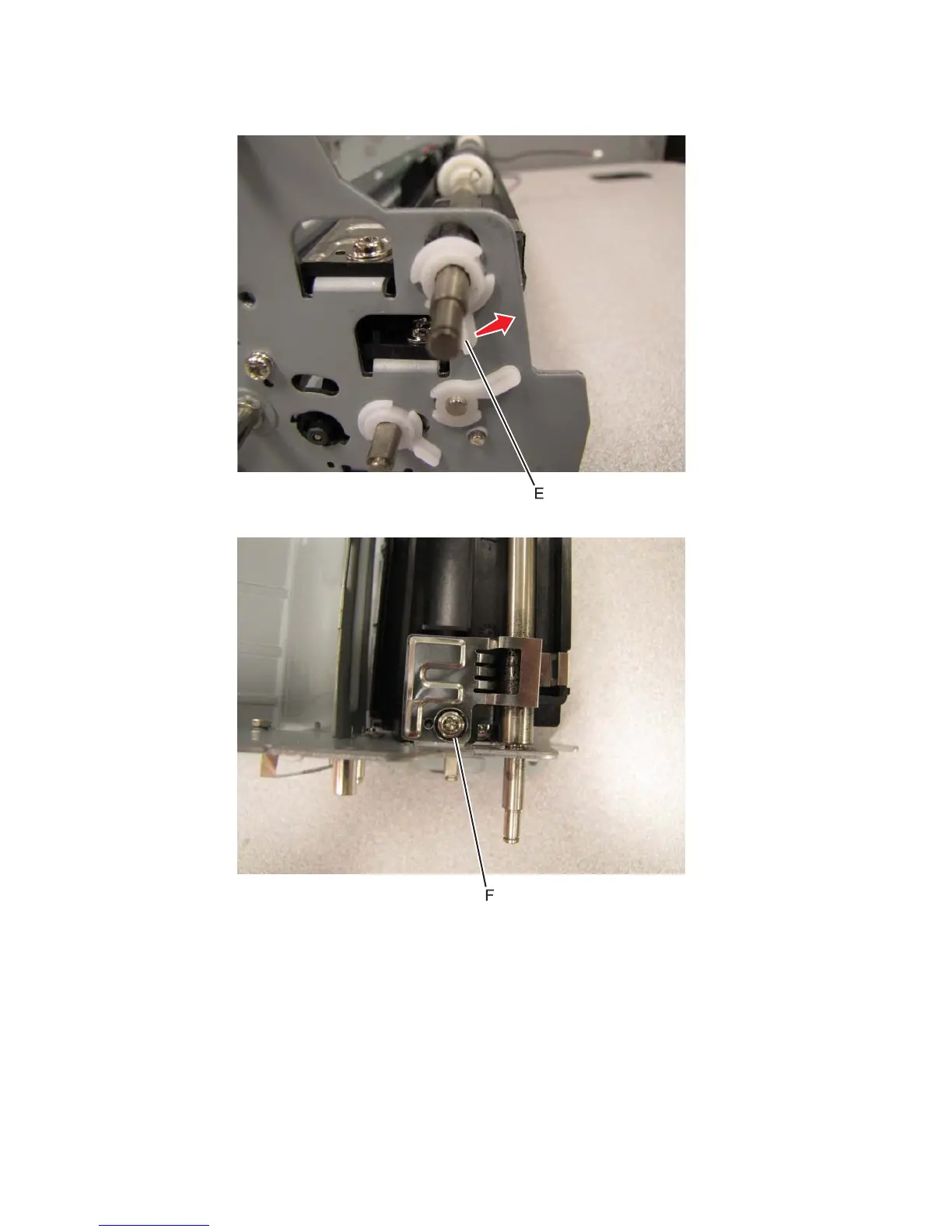 7. Remove the screw (F) securing the paper guide to the ADF main feed unit.