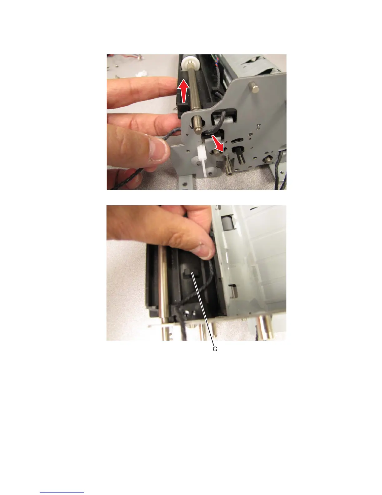 8. Lift the paper guide up and feed the duplex pass timing sensor cable through the ADF main feeder frame.
