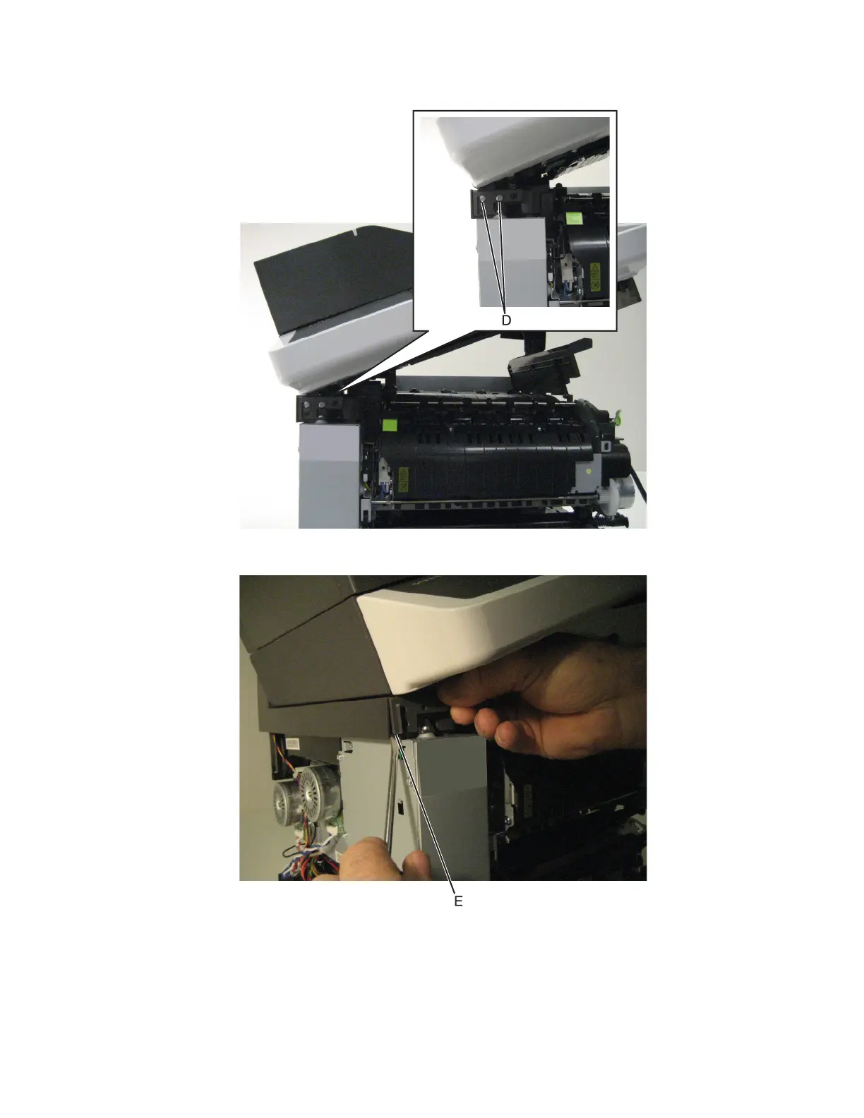 6 Remove the two screws (D) from the front left scanner hinge.