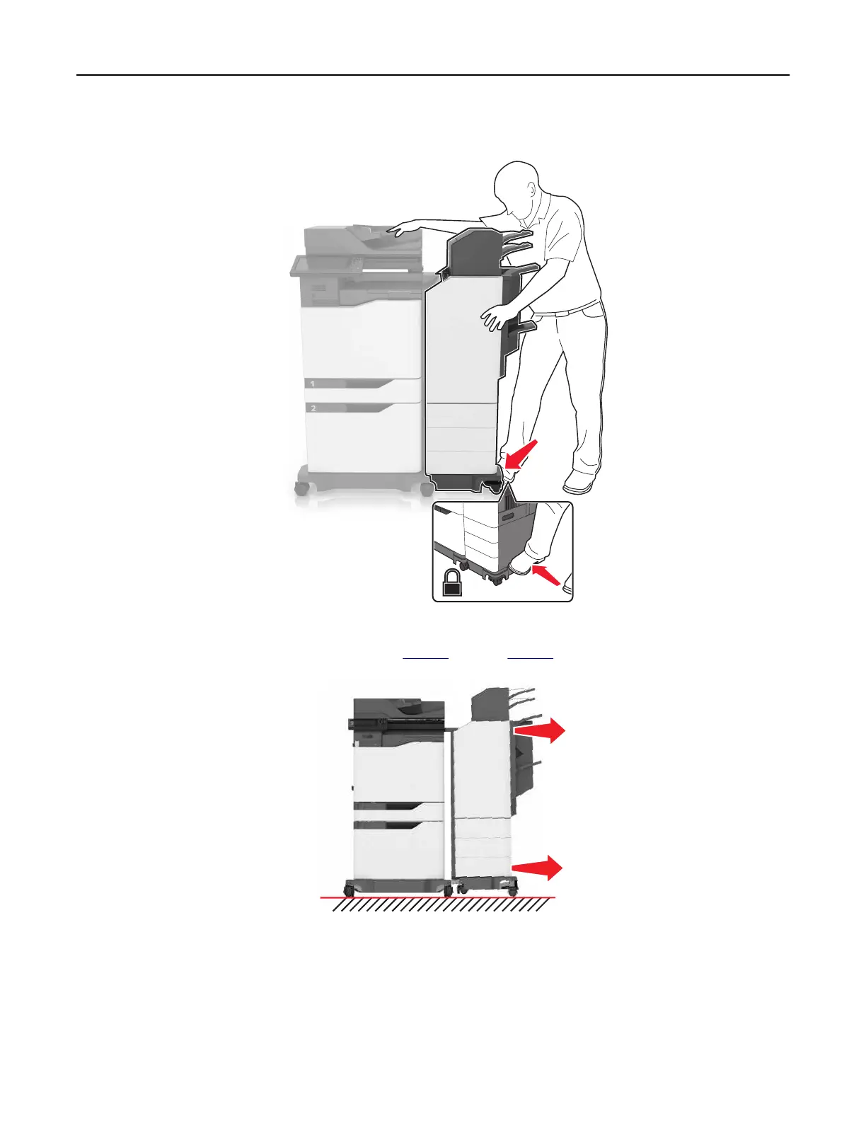 14 Push the finisher to the printer by applying pressure at the bottom of the finisher until it clicks into place.