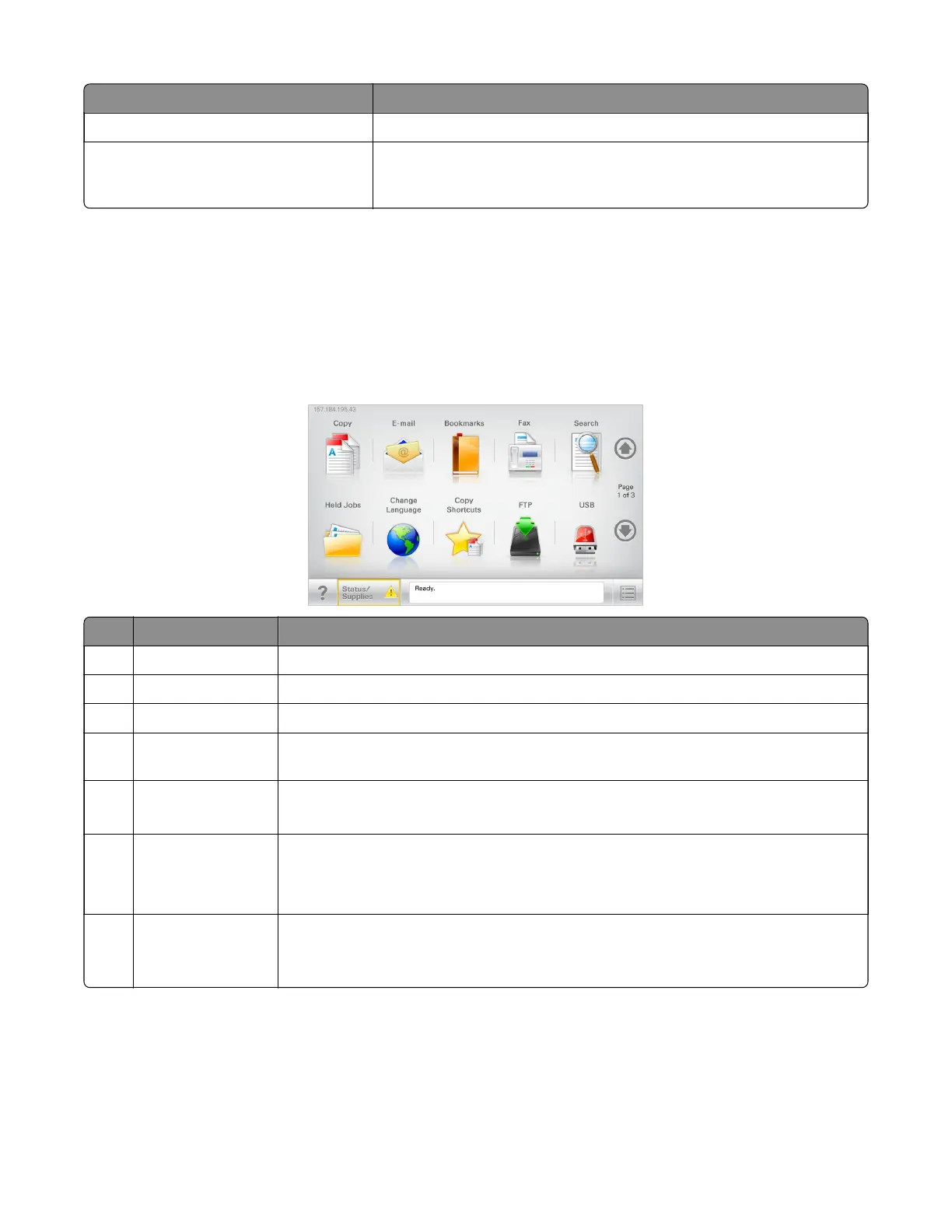 screen buttons and icons to initiate an action such as copying, faxing, or scanning; to open the menu screen;
