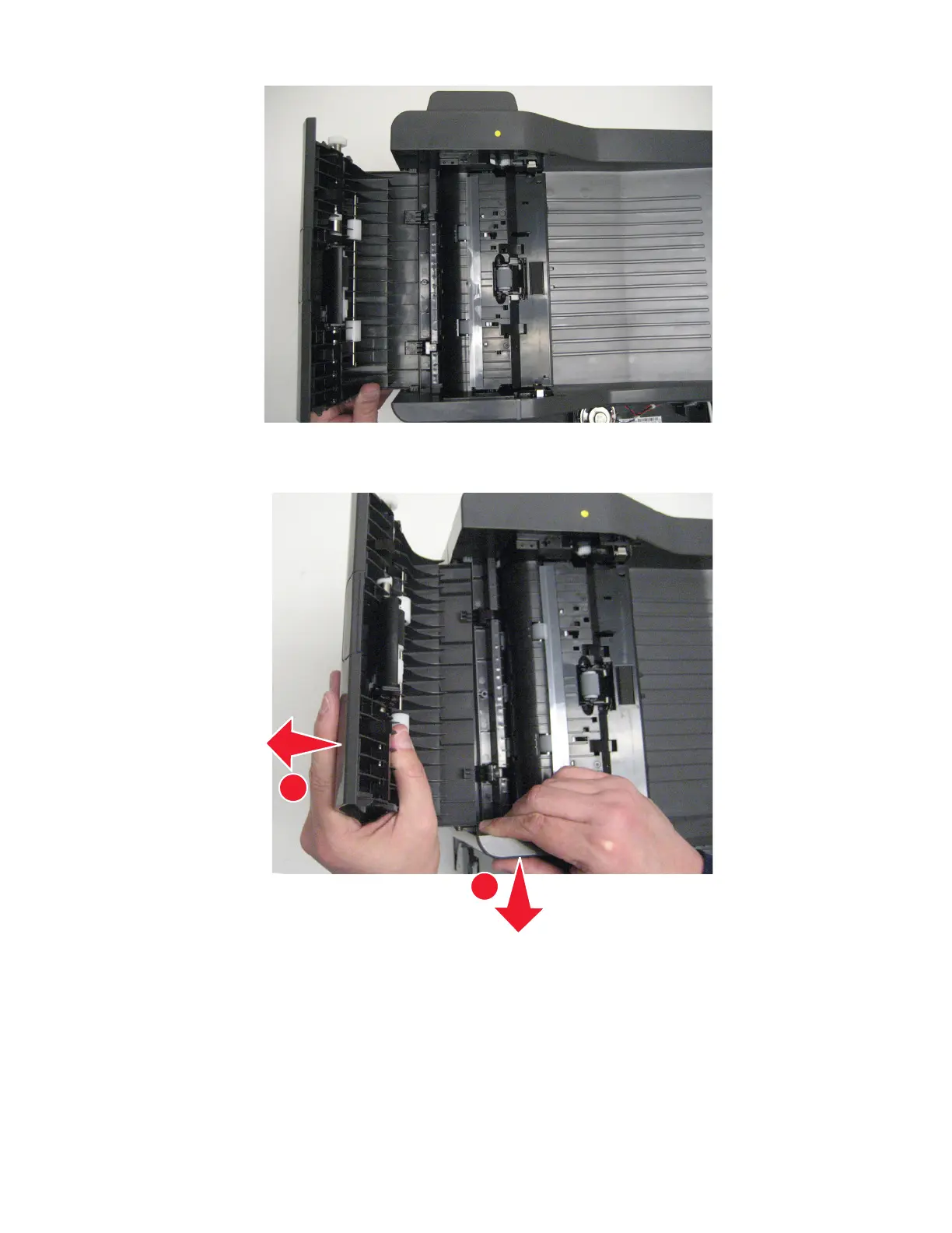 2 Release the cover by gently bending the ADF away from the top cover (1), and then lift the top cover (2) and