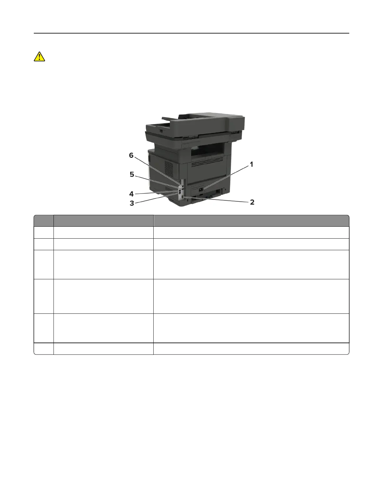 1 Power cord socket Connect the printer to an electrical outlet.