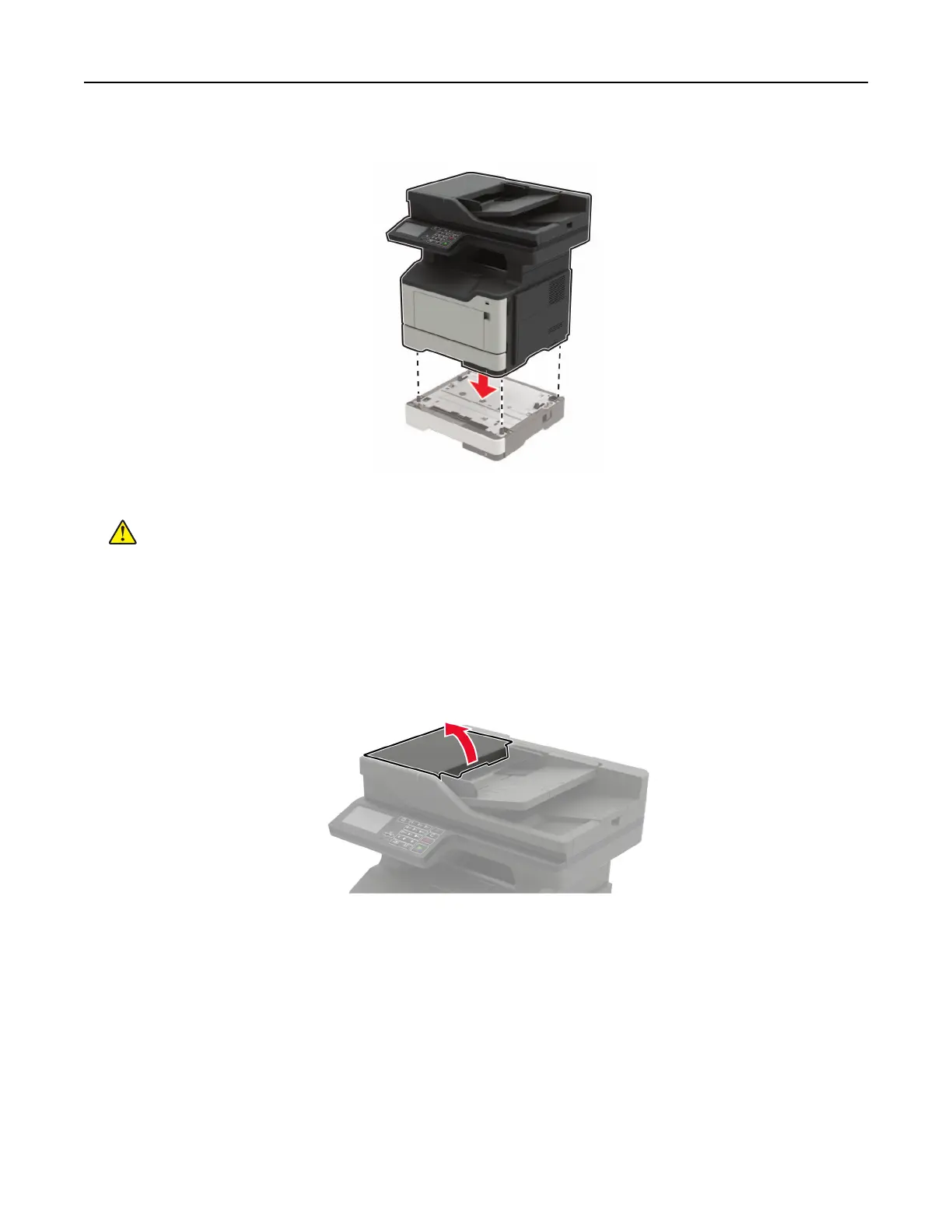 9 Align the printer with the optional tray, and then lower the printer until it clicks into place.