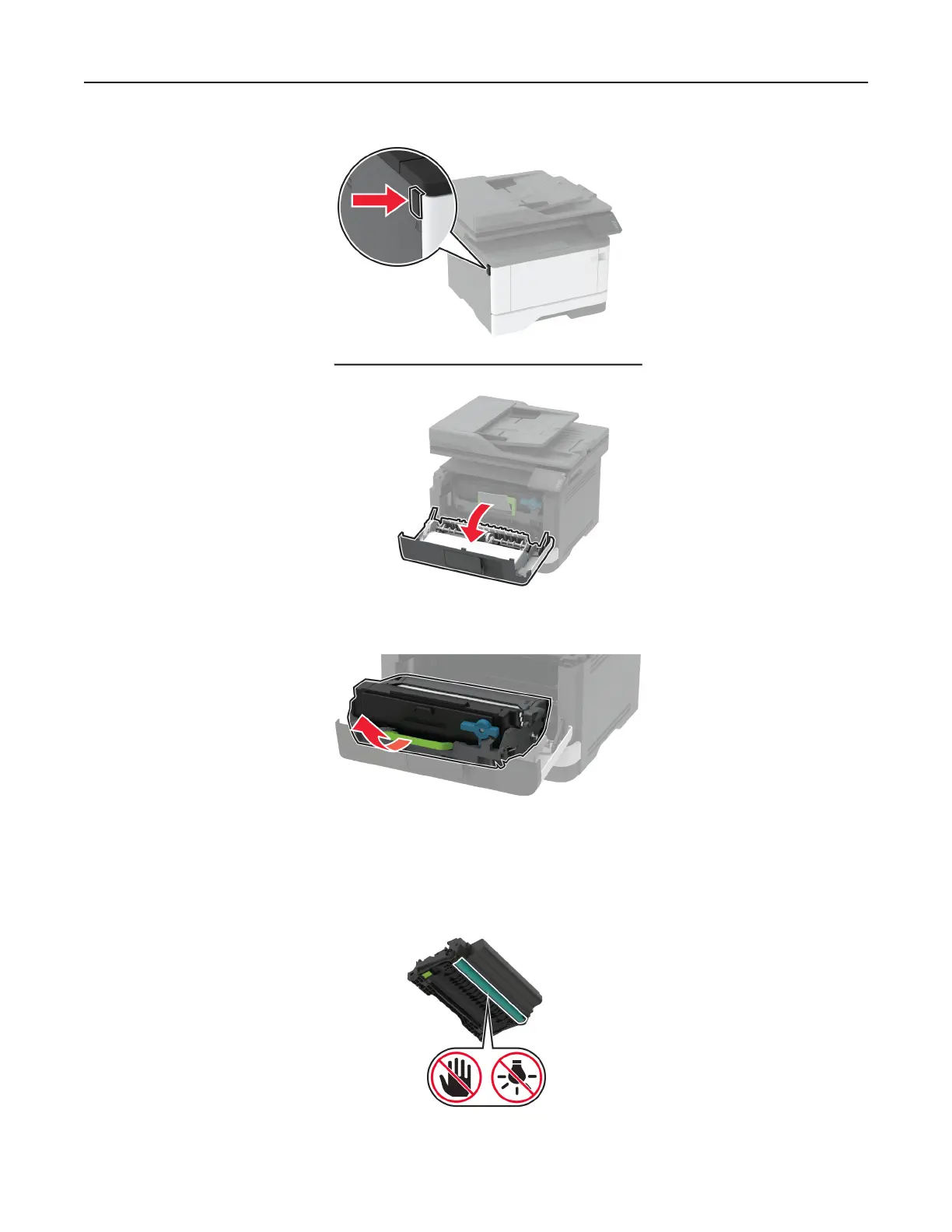 Warning—Potential Damage: Do not touch the photoconductor drum. Doing so may