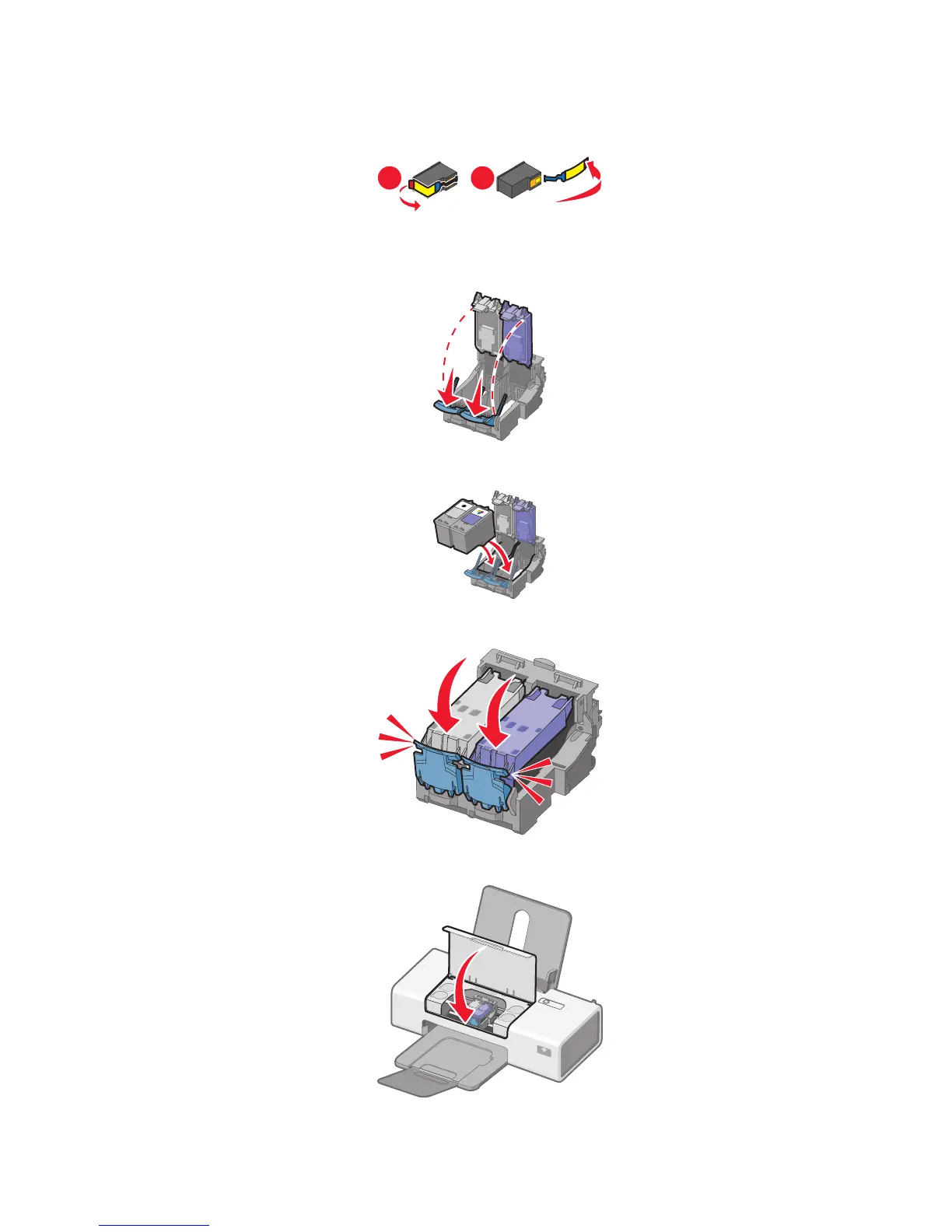 Warning: Do not touch the gold contact area on the back or the metal nozzles on the bottom of the cartridges.