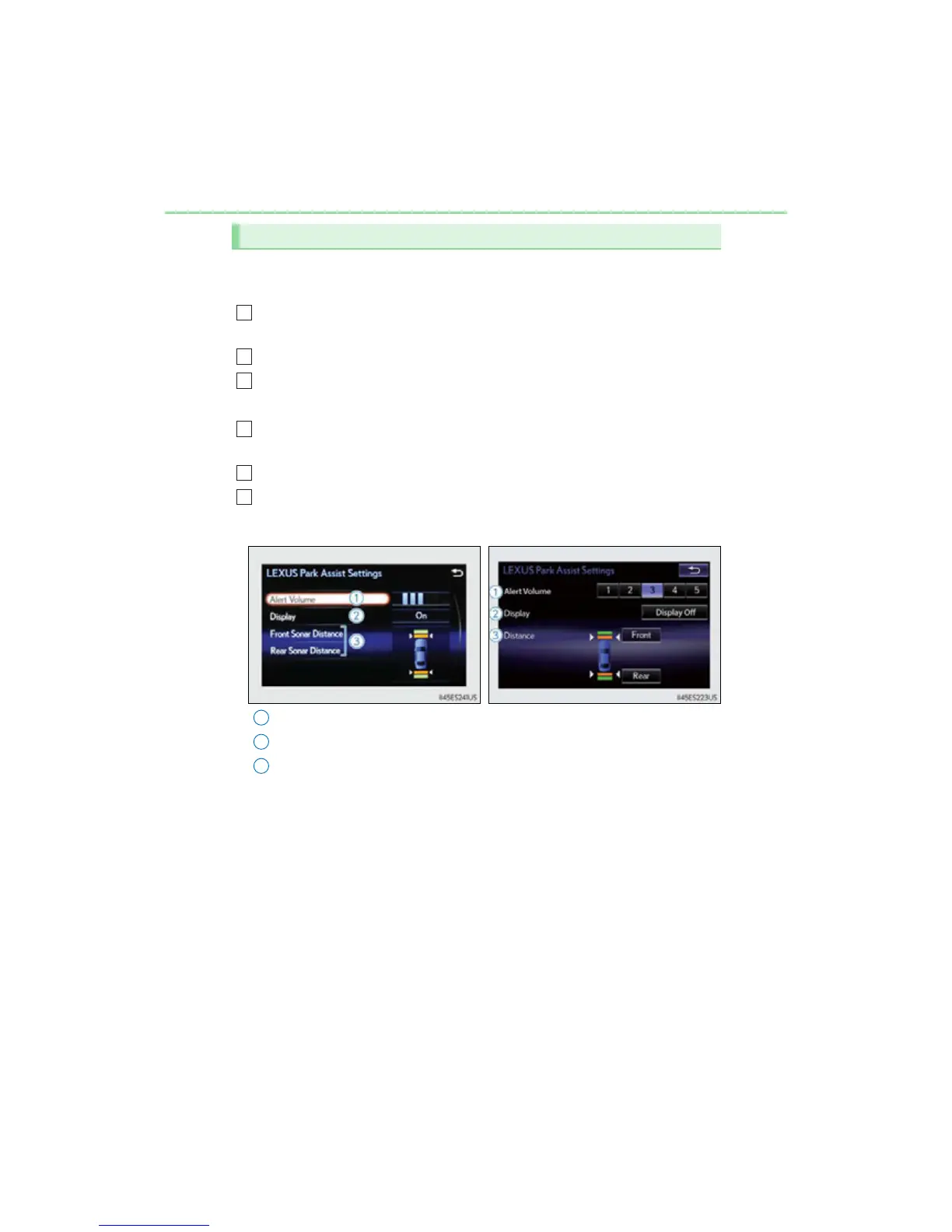 Select “Vehicle”, and then select “LEXUS Park Assist” on the screen.