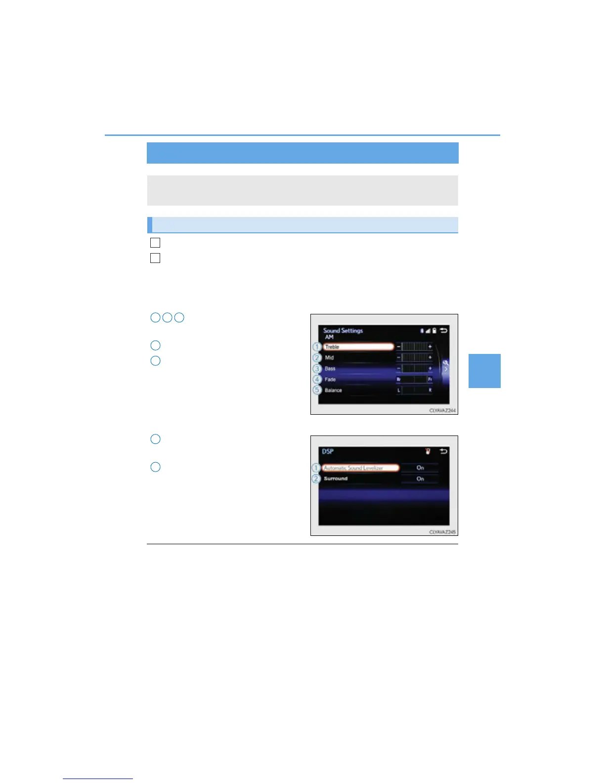 On the “Sound Settings” screen, sound quality (Treble/Mid/Bass), volume