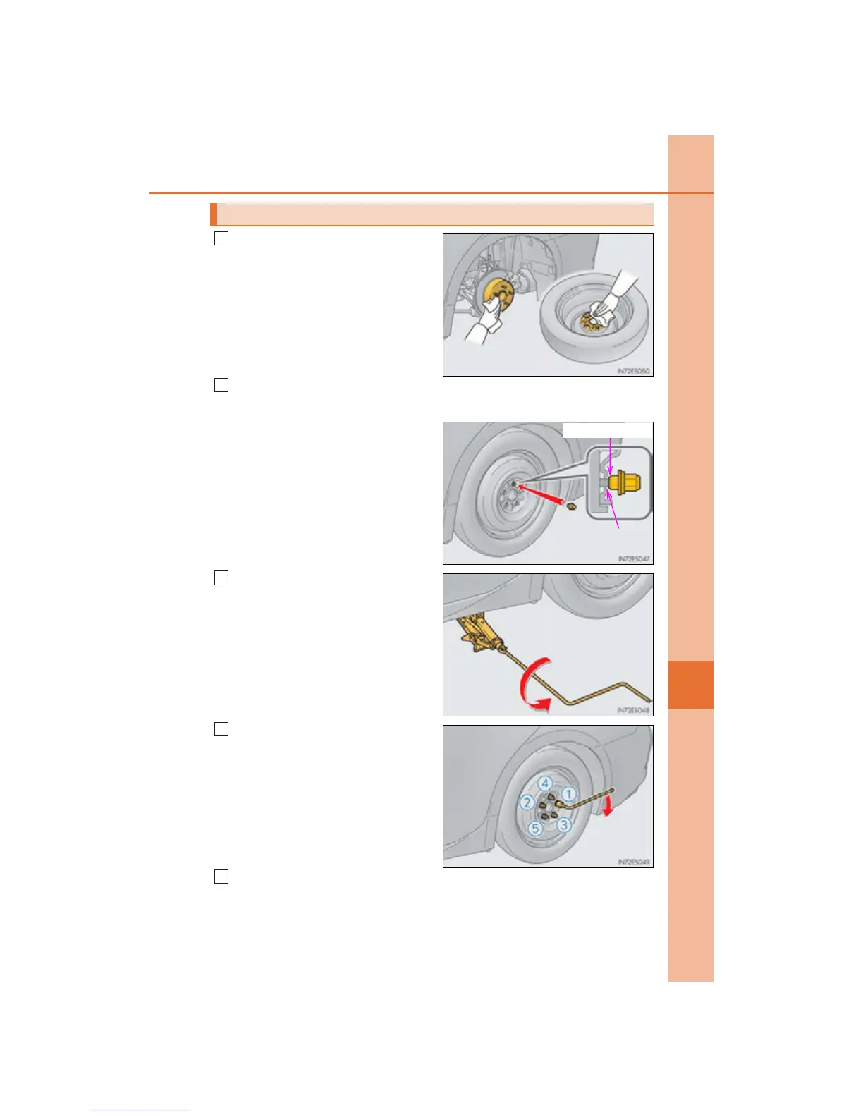 Install the spare tire and loosely tighten each wheel nut by hand by approxi-