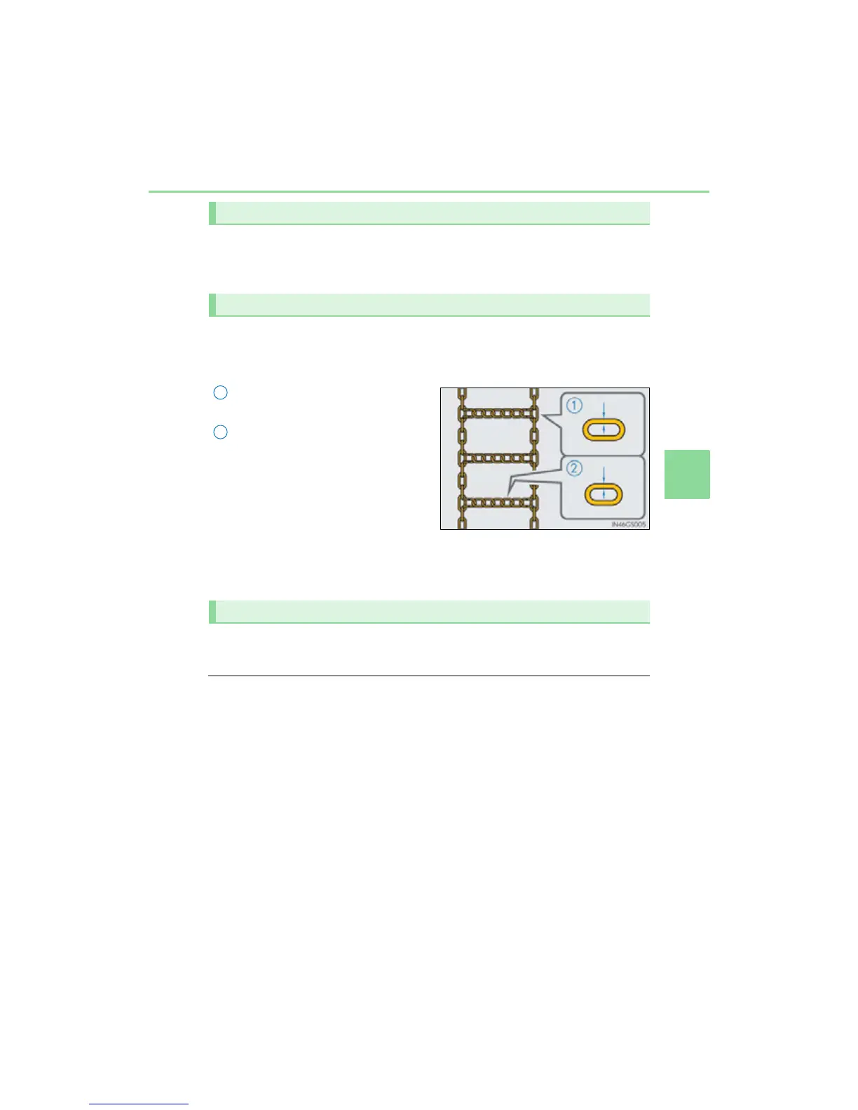 ● Install tire chains on rear tires as tightly as possible. Retighten chains after driving 1/4
