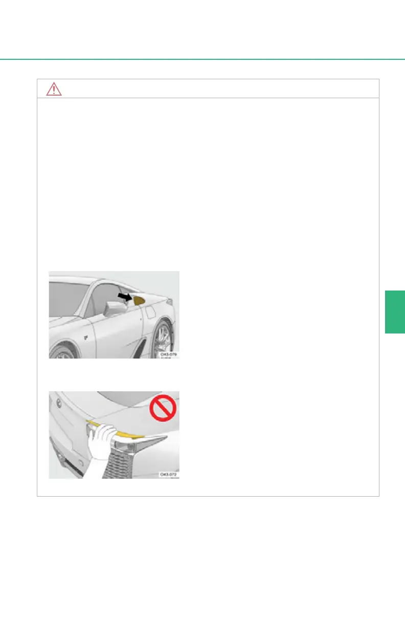 ● Do not attach stickers or apply water repellent coating to the rear quarter glass.