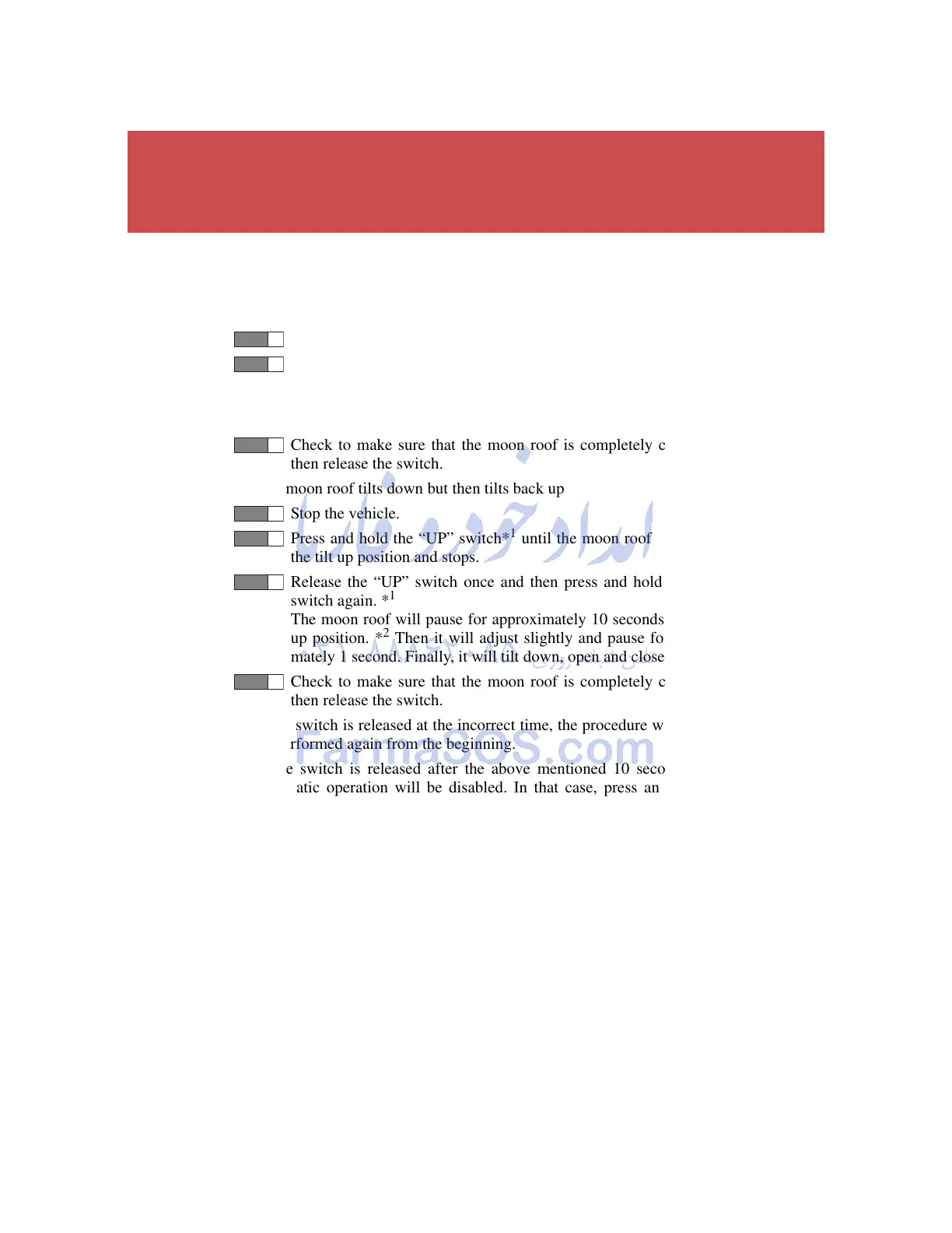 “CLOSE” or “UP” switch, and the moon roof will tilt up and pause for