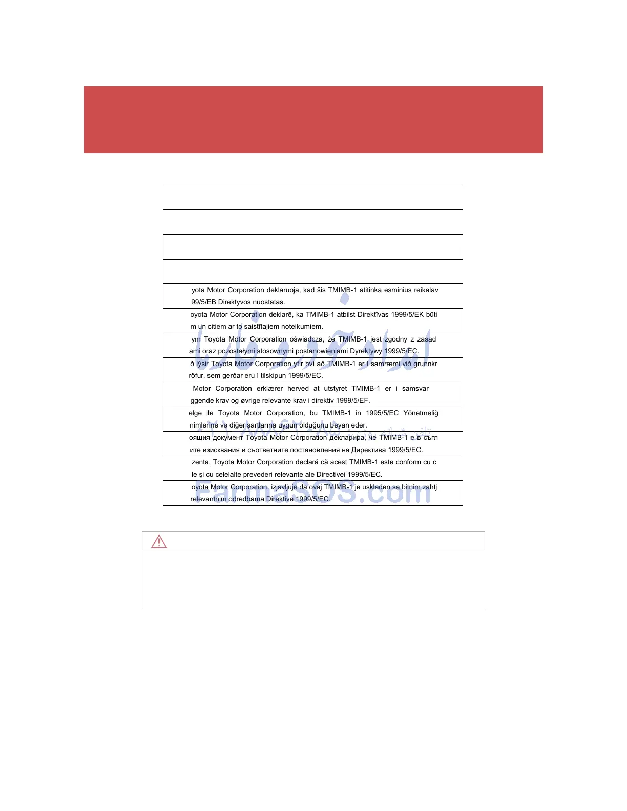 Ar šo Toyota Motor Corporation deklarƝ, ka TMIMB-1 atbilst DirektƯvas 1999/5/EK bnjtiskajƗm