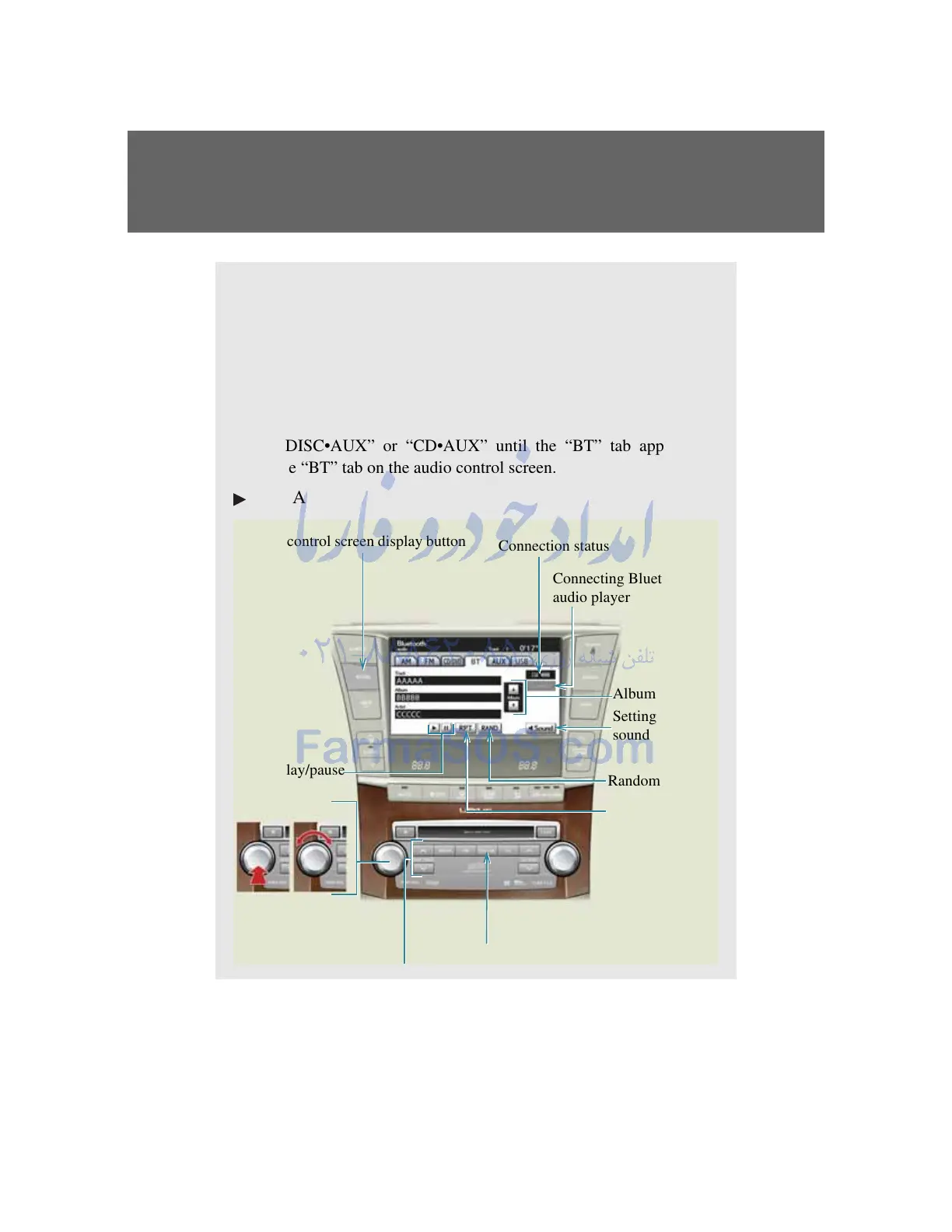Press “DISC•AUX” or “CD•AUX” until the “BT” tab appears or