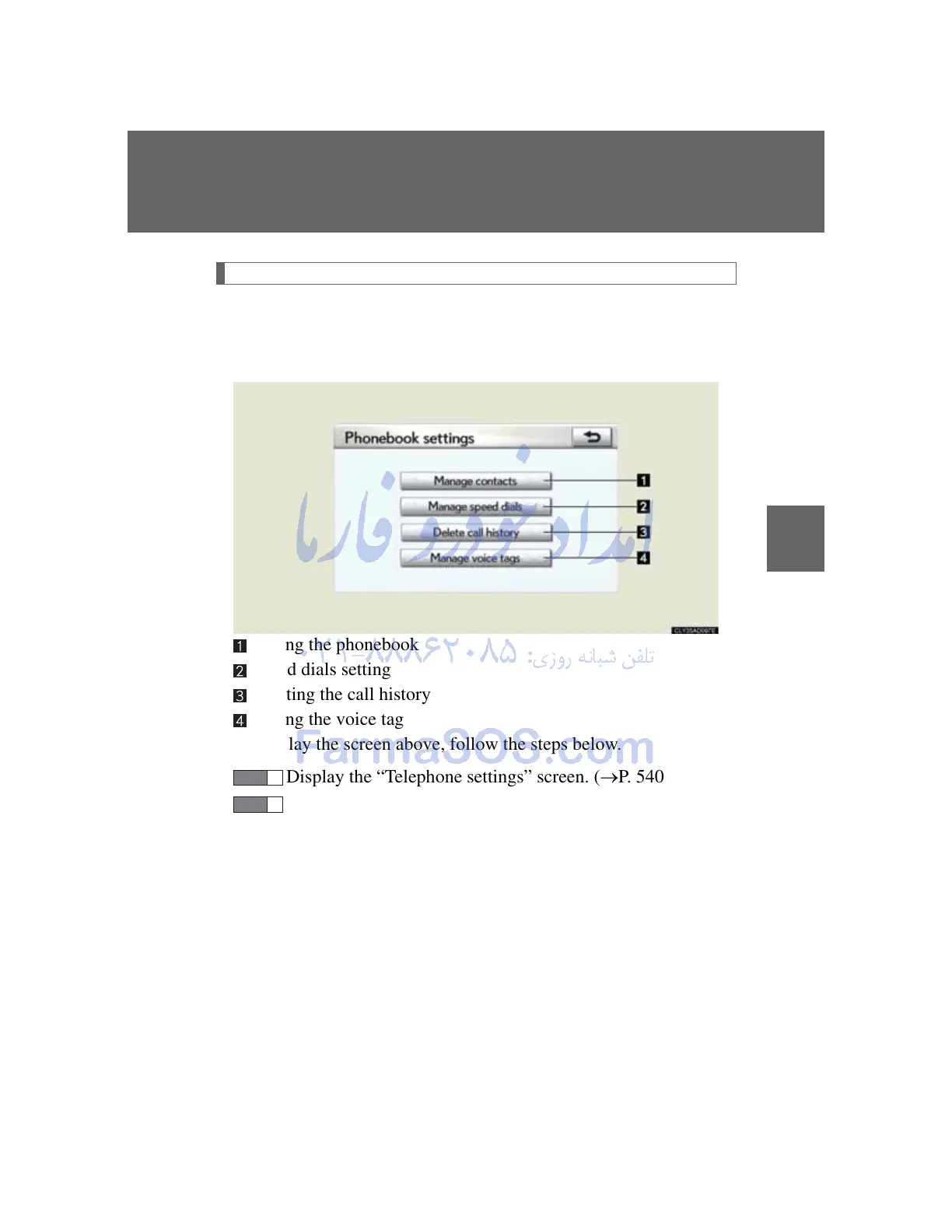 Display the “Telephone settings” screen. (P. 540)