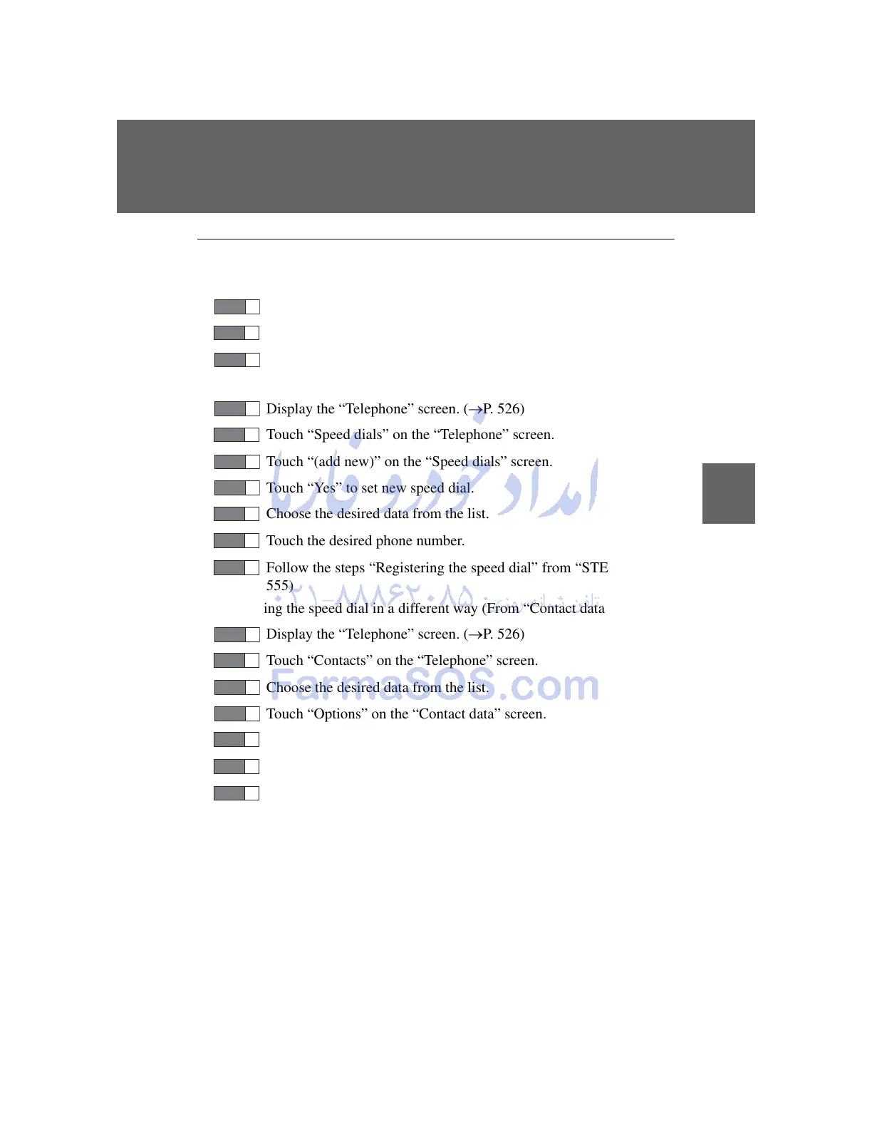 Display the “Telephone” screen. (P. 526)