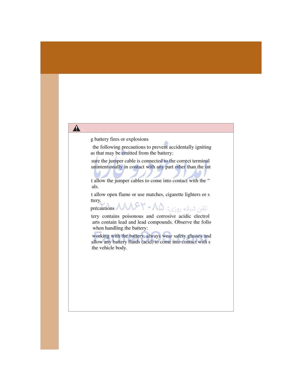 not to allow any battery fluids (acid) to come into contact with skin, cloth-