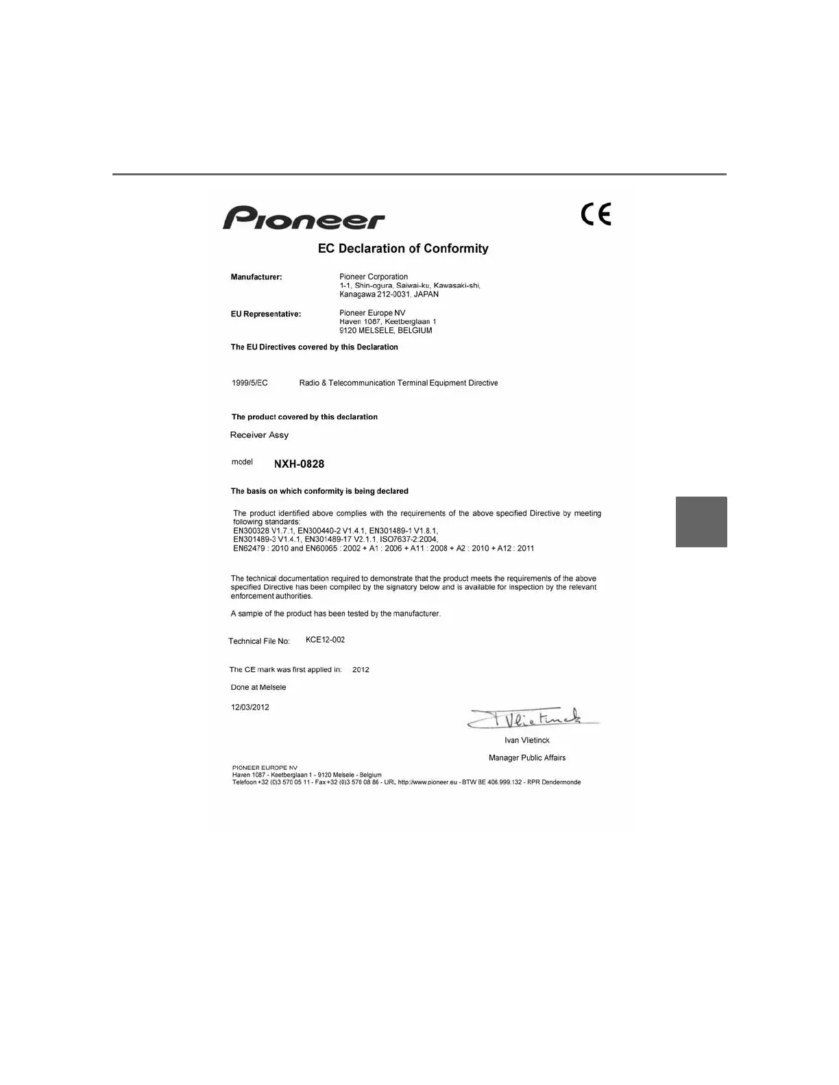 Ovim PIONEER, izjavljuje da je NXH-0828 u sklau s bitnim zahtjevima dru-