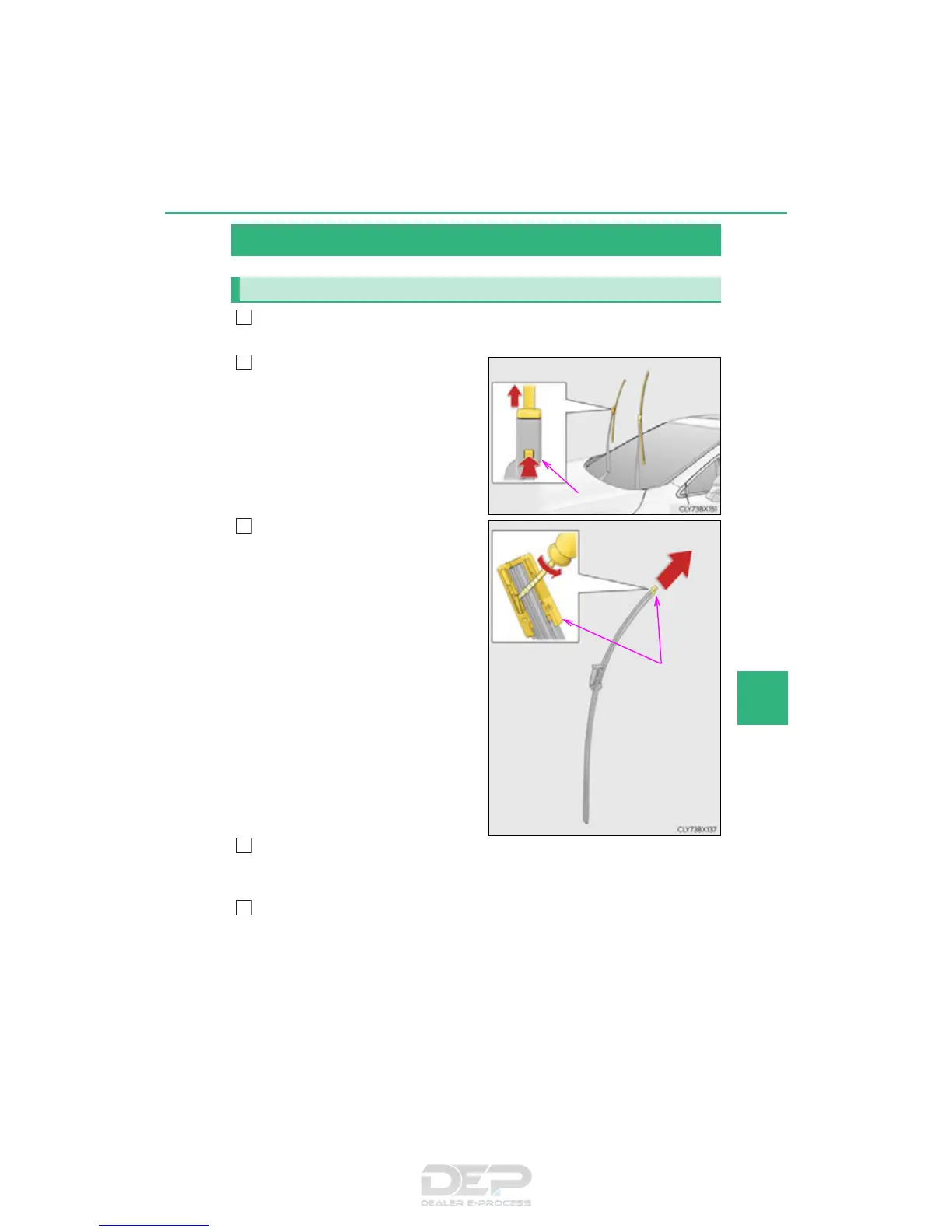 the wiper lever and then lift a windshield wiper. (P. 254)