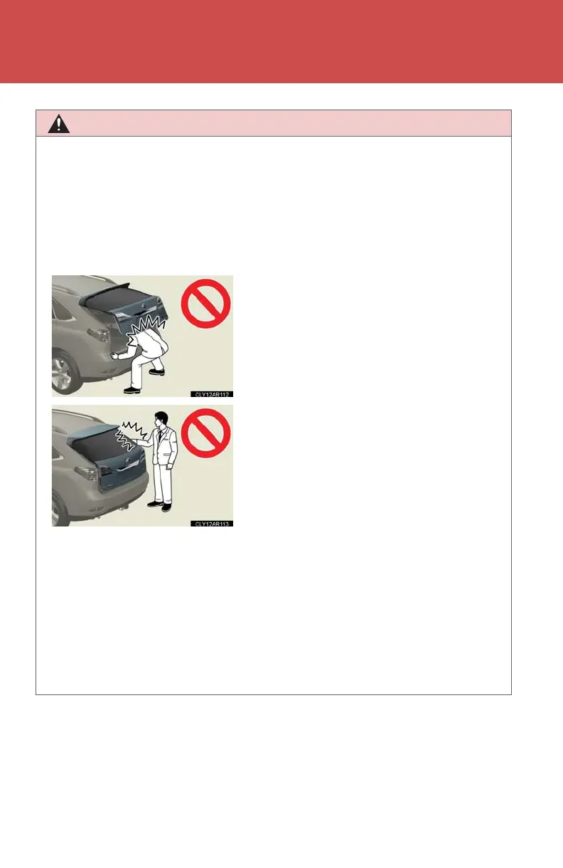 ● When opening or closing the back door, thoroughly check to make sure the sur-