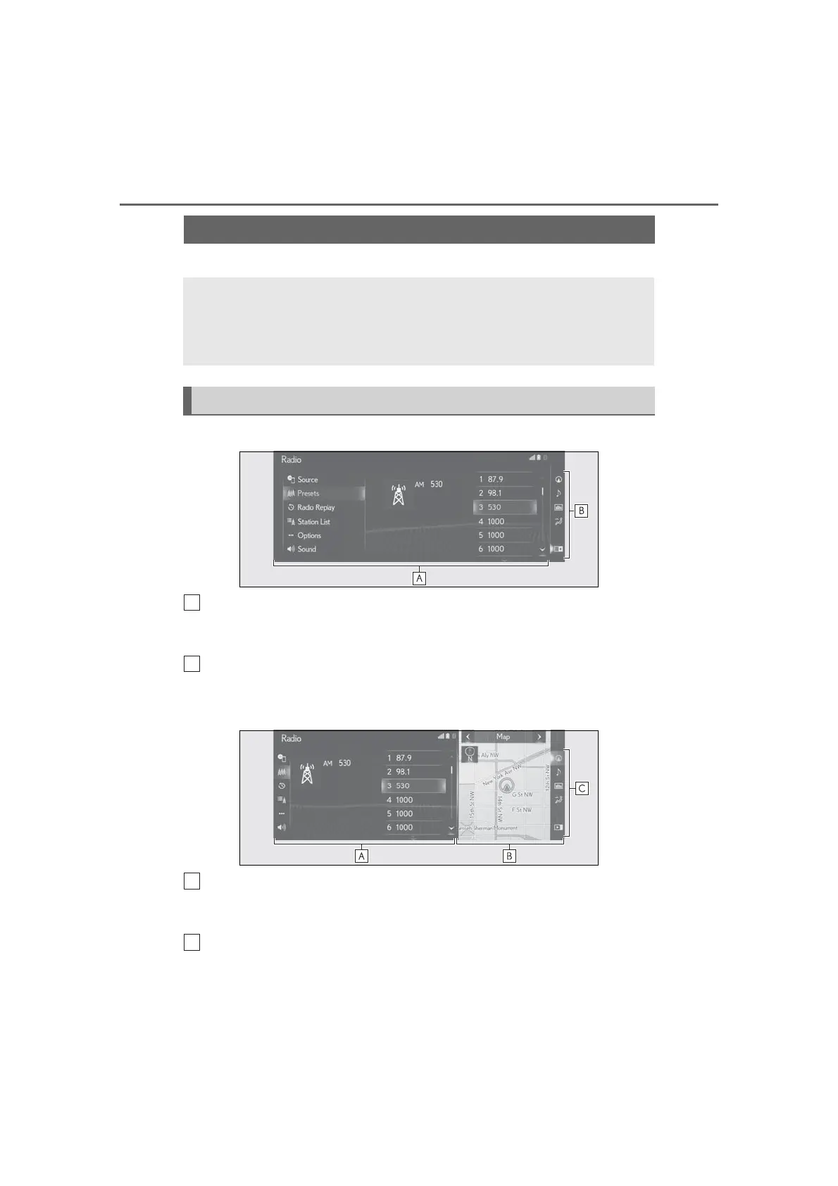 The screen can be operated in full screen or split-screen mode. Split-screen