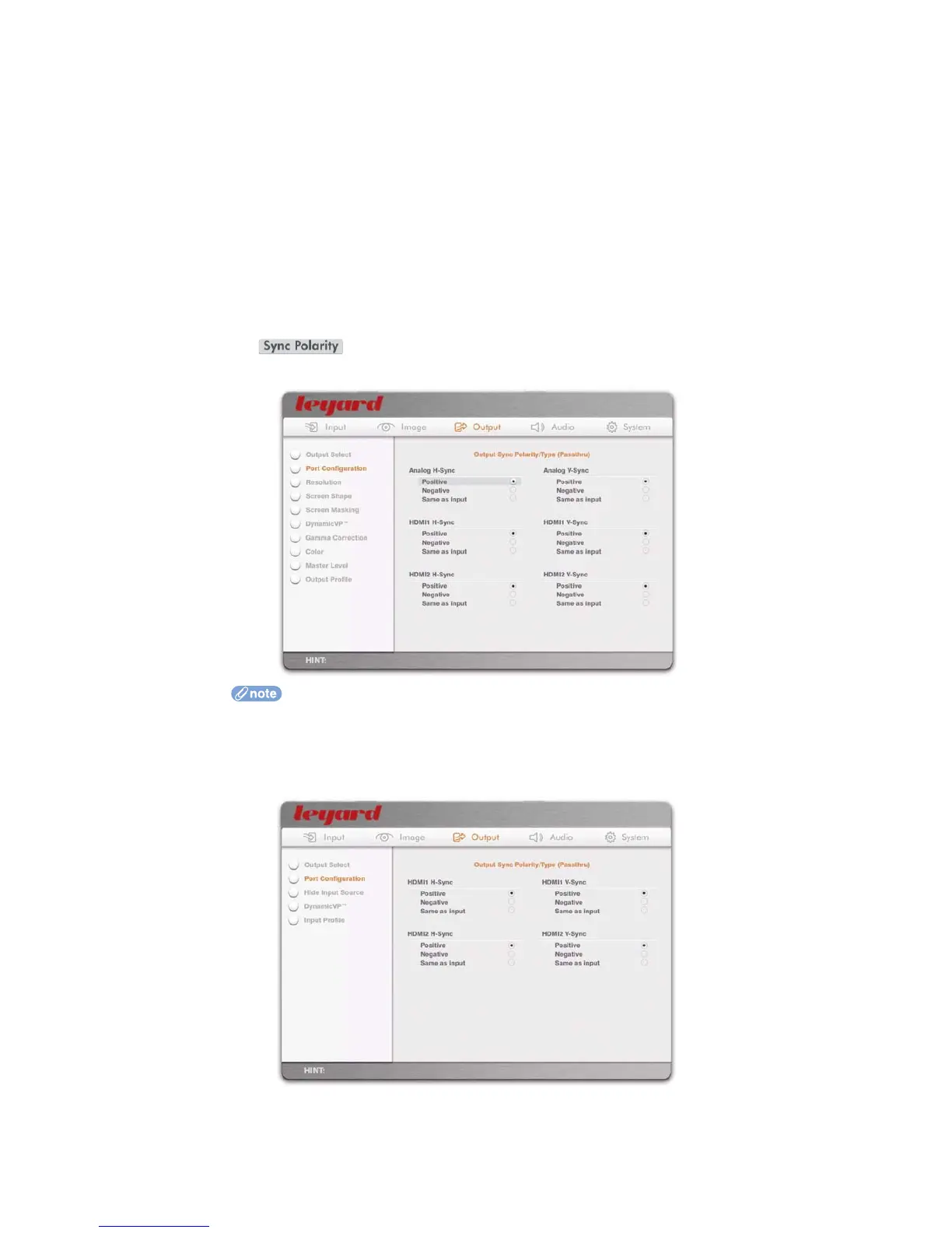 When Analog output is RGBHV or RGBS, Horizontal and Vertical sync polarities can be defined as: