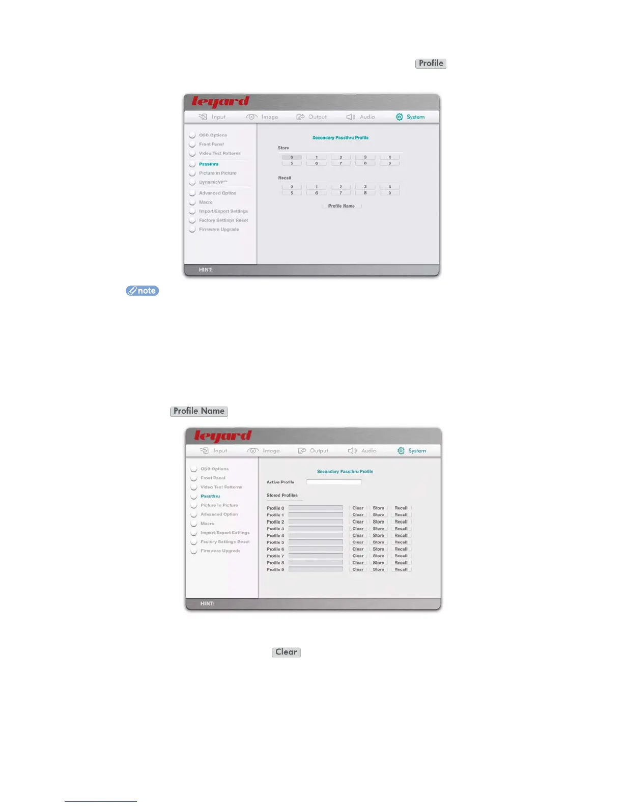 Recall any secondary passthru profile by pressing the desired profile number under Recall