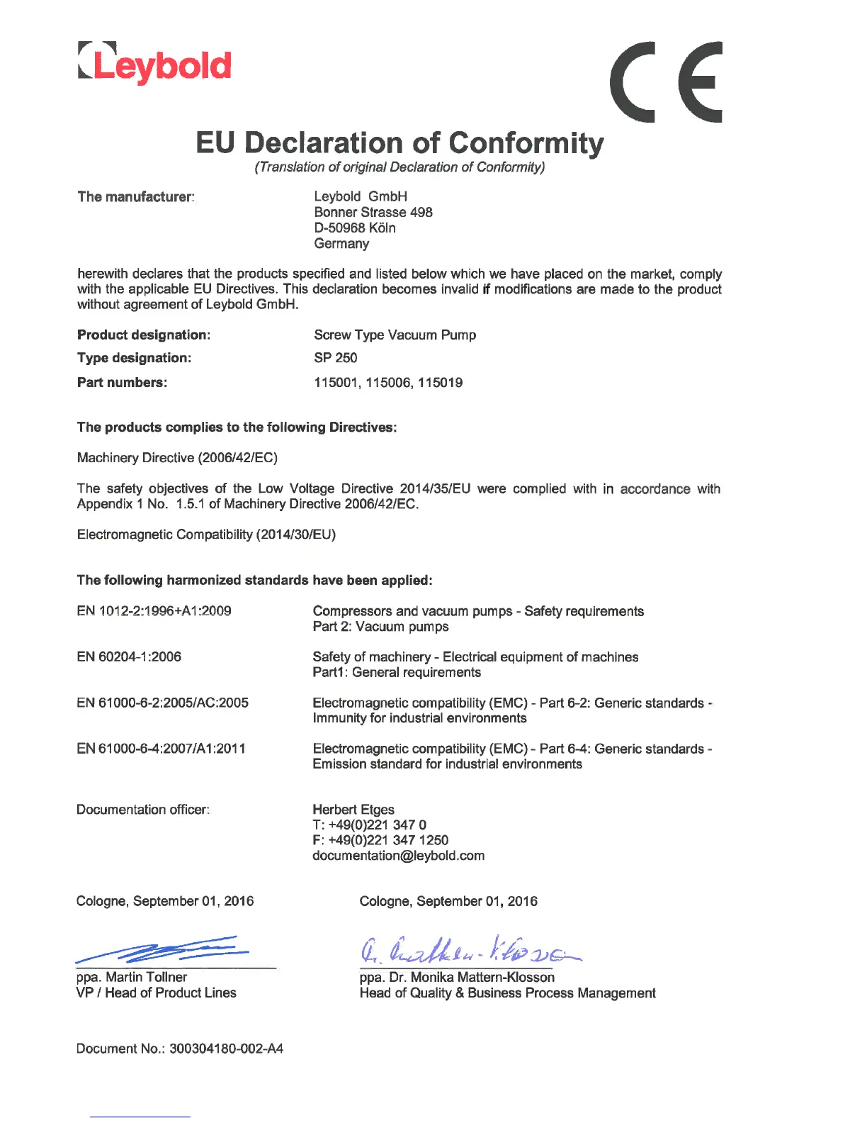 LEYBOLD ScrewLine SP250 - EC Declaration of Conformity