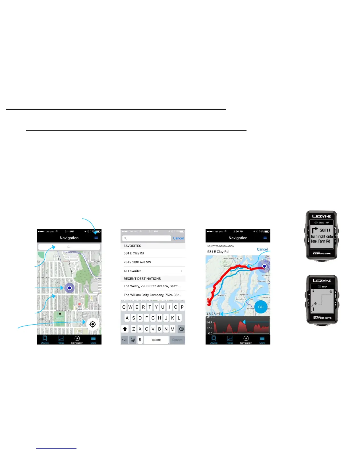 In the Lezyne GPS Ally App v2, on the Navigation tab, you can search