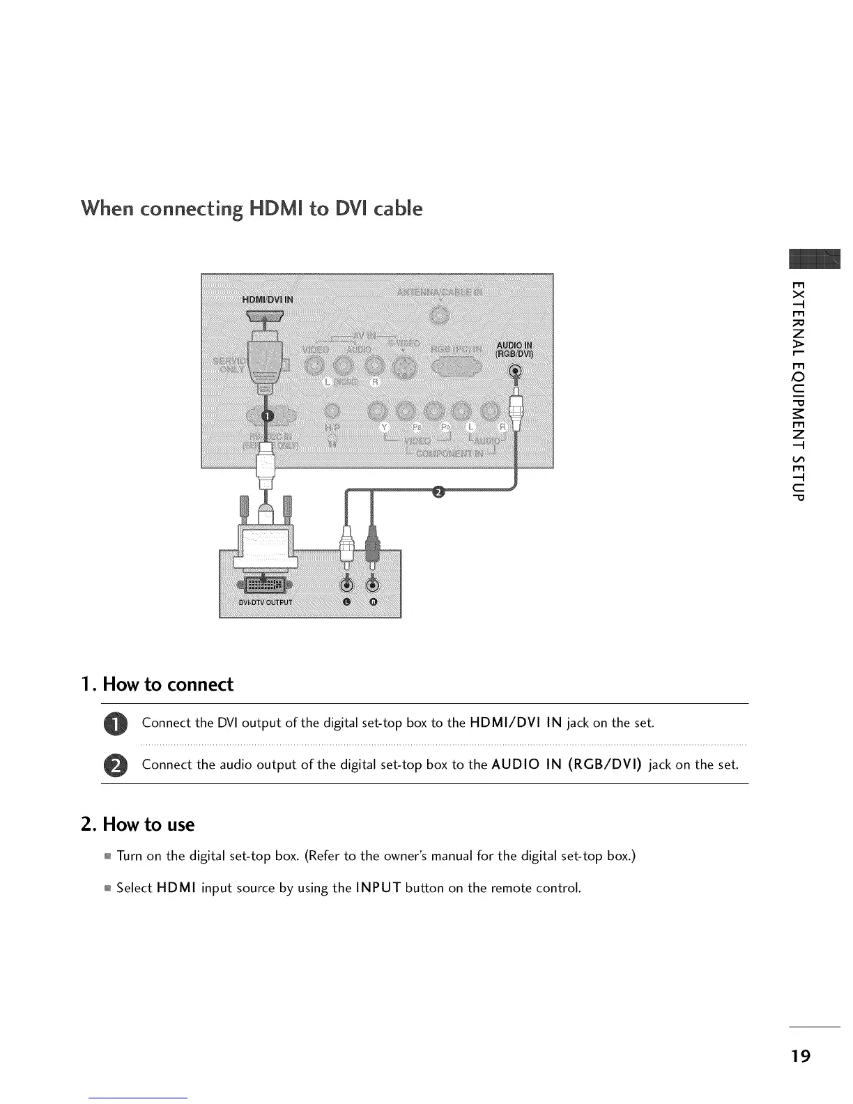 Connect the DVI output of the digital set-top box to the HDMI/DVI IN jack on the set.