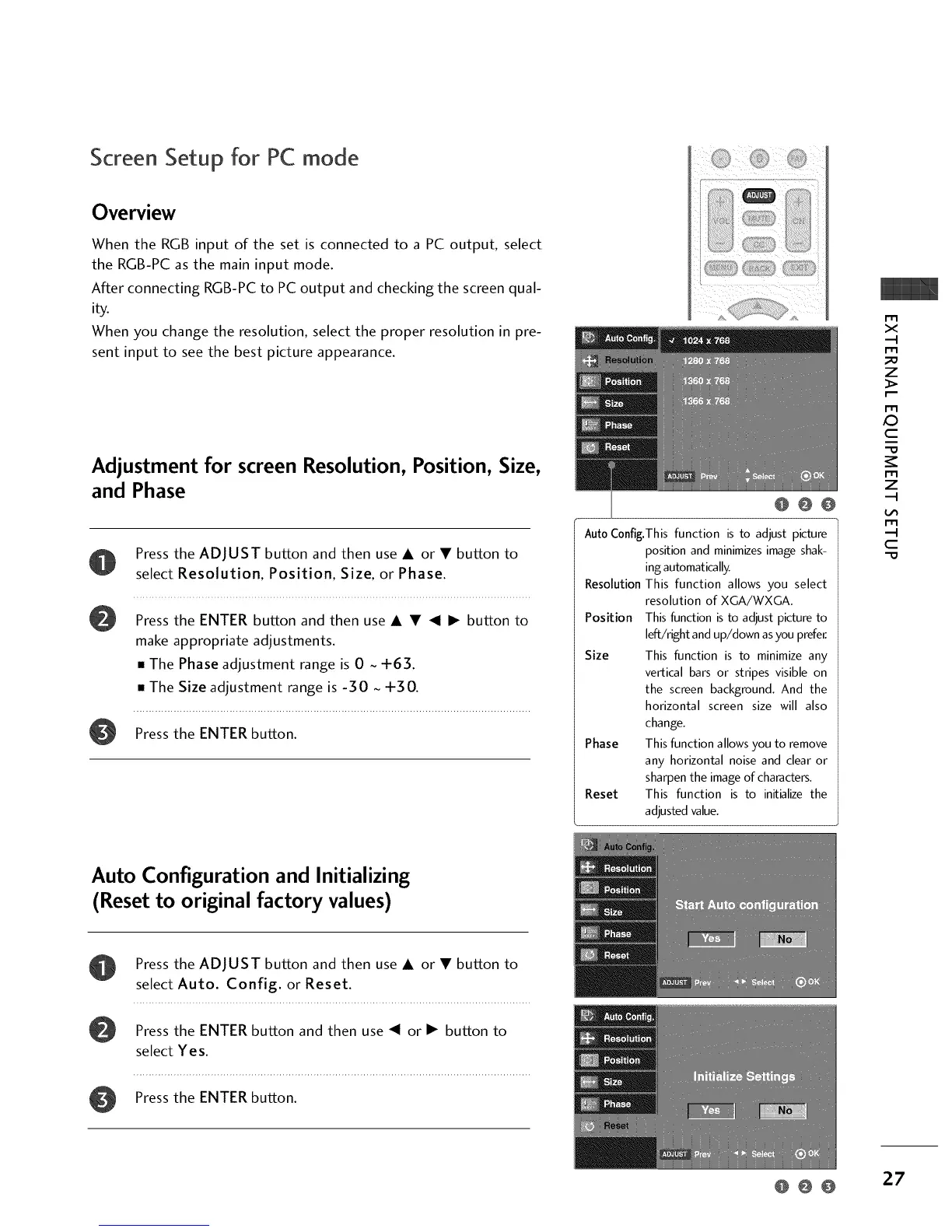 Adjustment for screen Resolution, Position, Size,