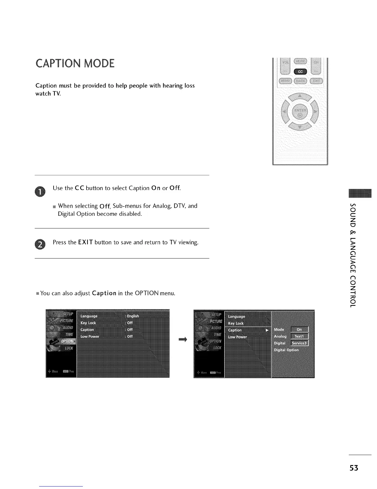Use the CC button to select Caption On or Off.