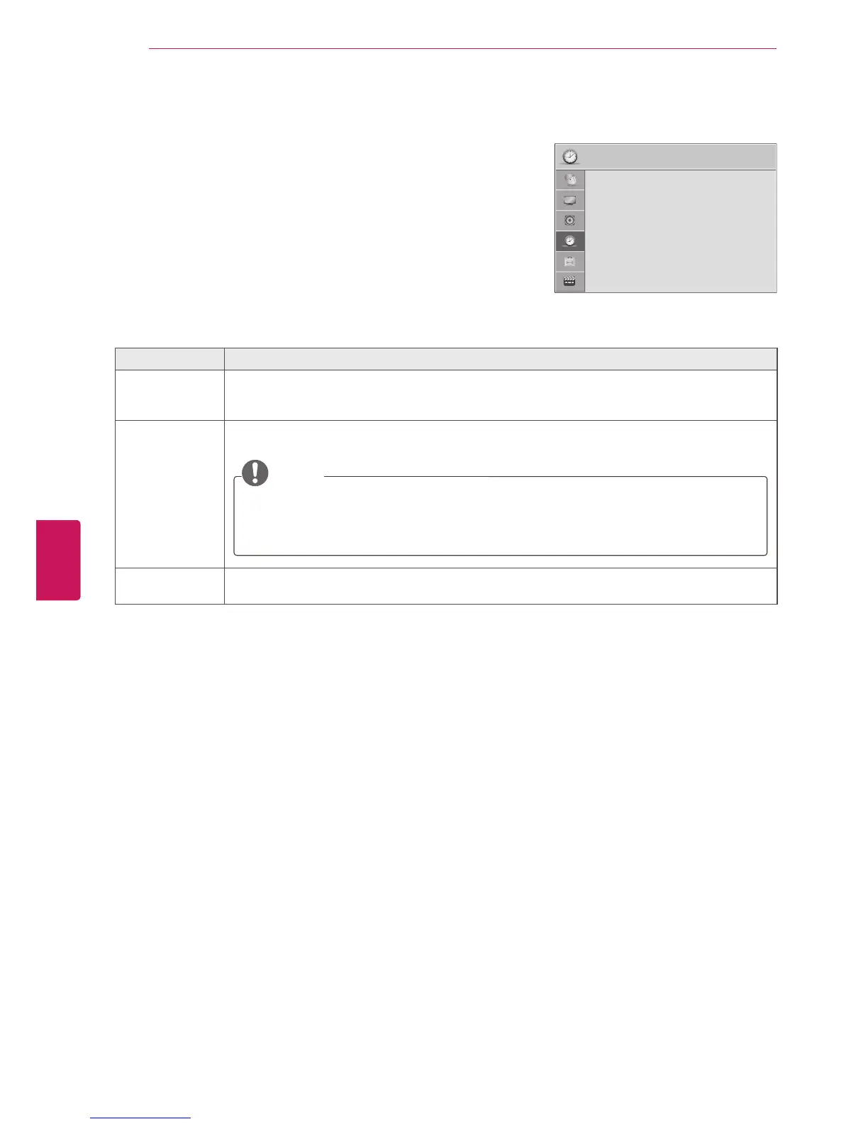 Off Time/On Time Sets the time to turn on or off the TV automatically. To use this function, you should set the current