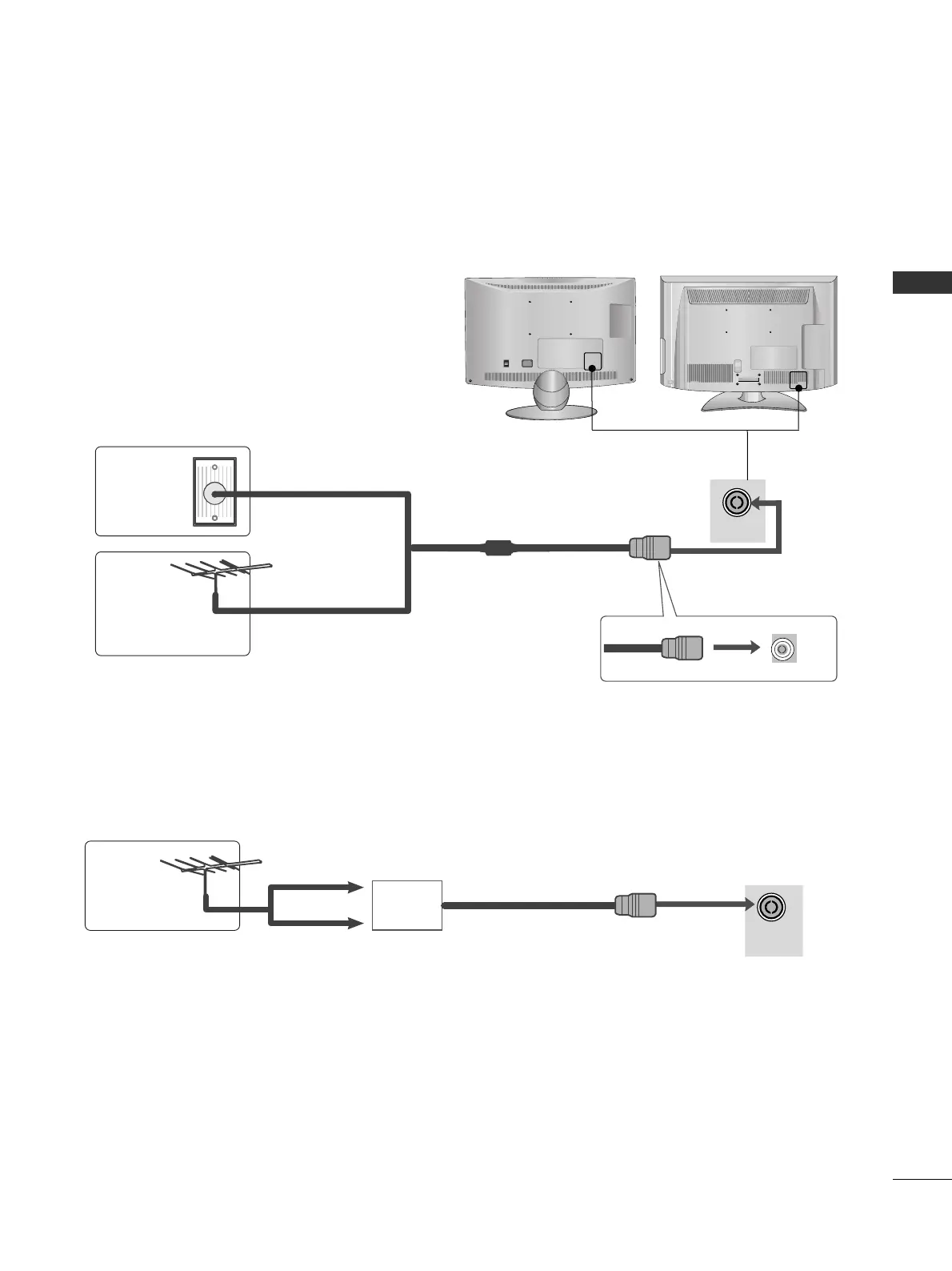 If signal needs to be split for two TVs, use an antenna signal splitter for connection.