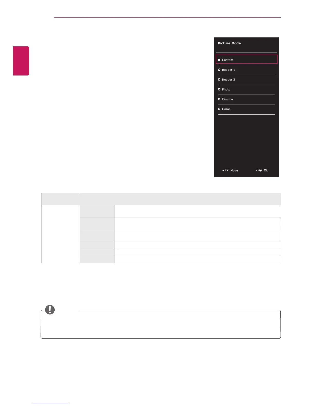 Picture Mode Custom Allows the user to adjust each element. The color mode of the main menu can be