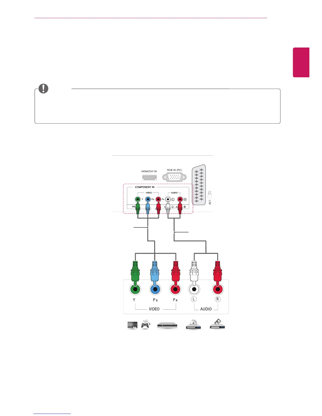 device and the TV with the component cable as shown on the following illustration. To display images by