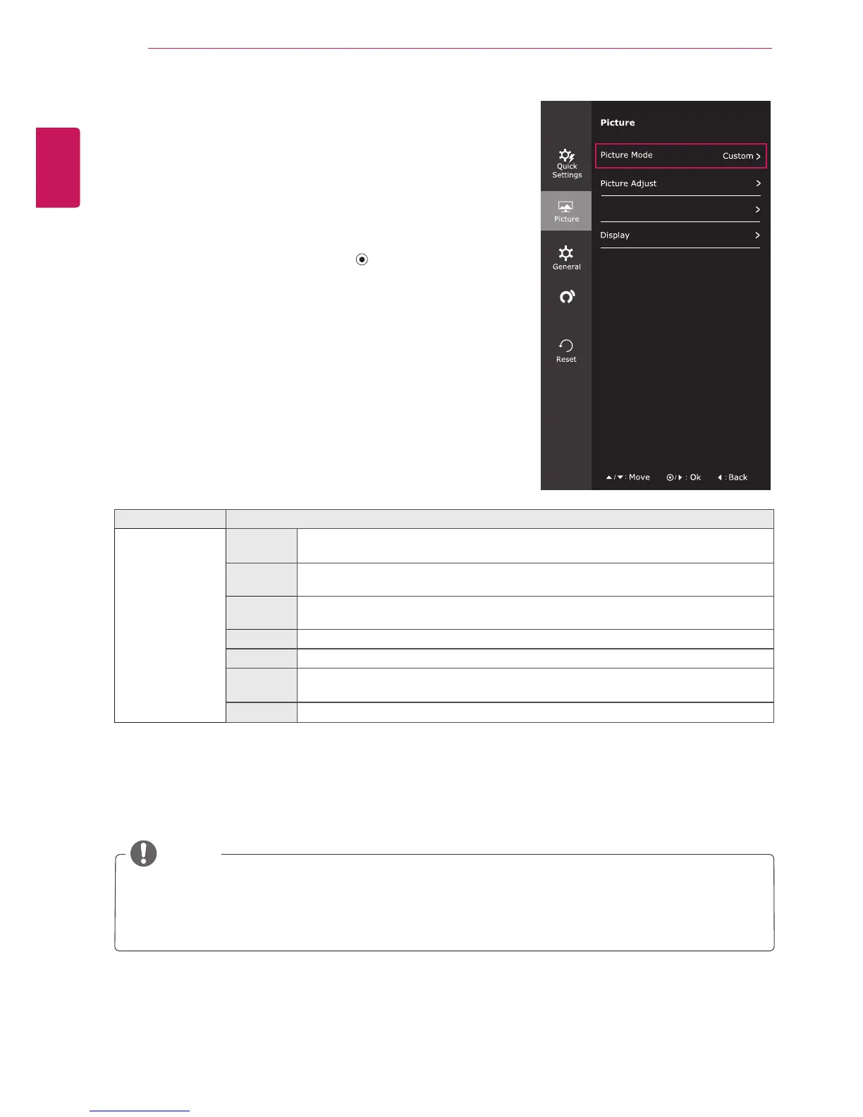 Picture Mode Custom Allows the user to adjust each element. The color mode of the main menu can be ad-