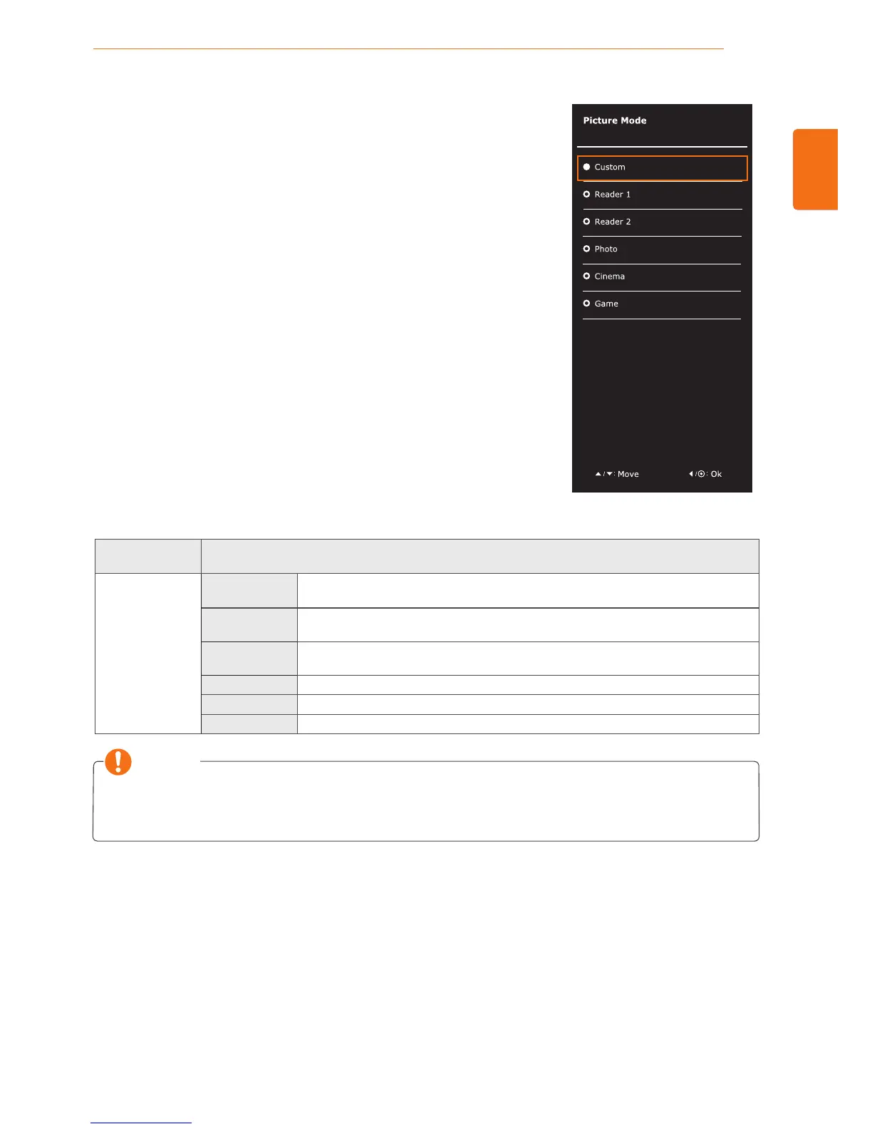 Picture Mode Custom Allows the user to adjust each element. The color mode of the main menu can be
